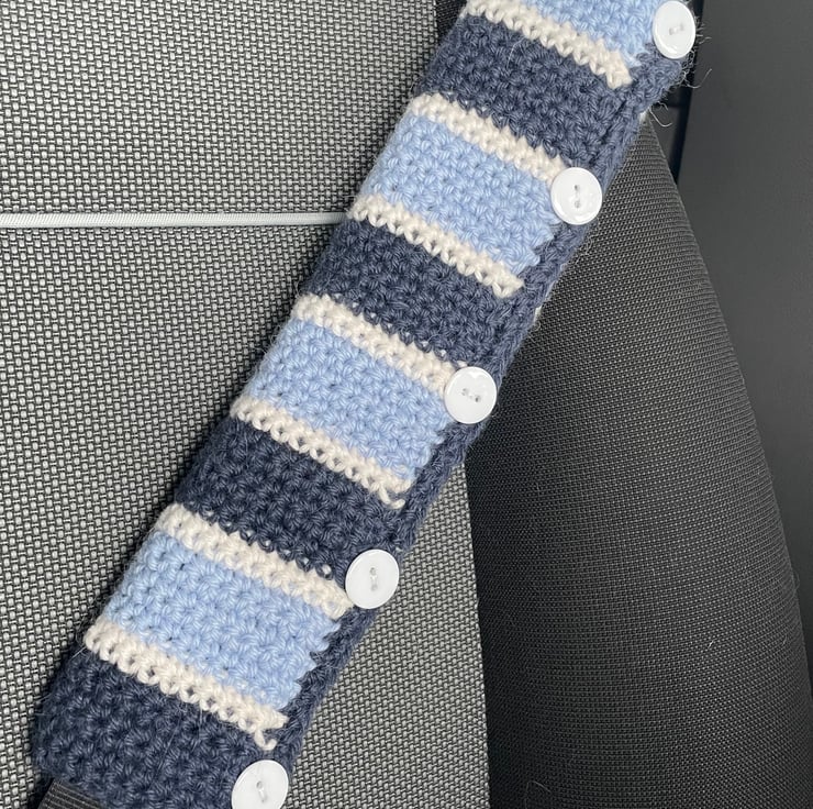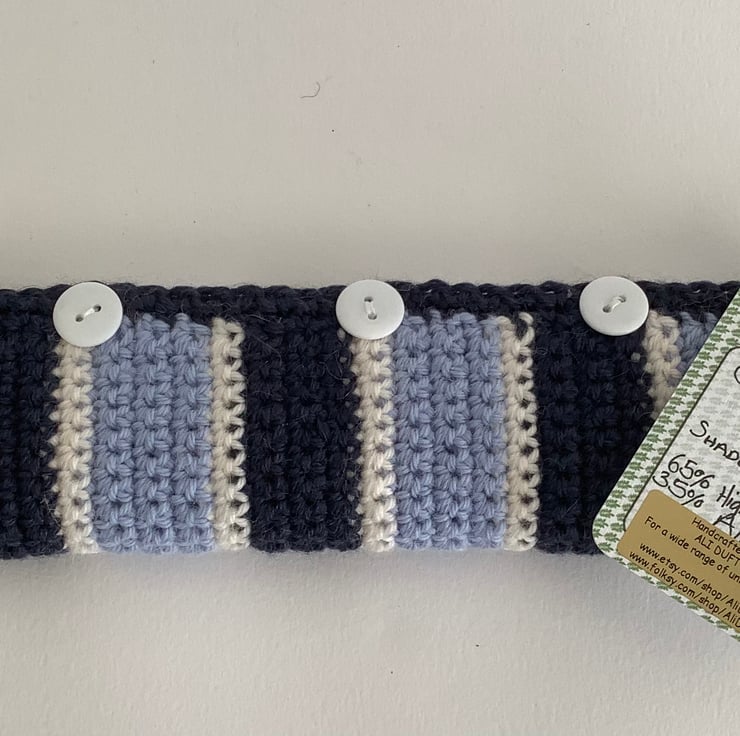 I have designed and crocheted this car seatbelt cover / sleeve/ cosy for those that find a seatbelt can sometimes cut in or be generally uncomfortable . Made using the softest Alpaca/ wool blend yarn and with a covered layer of foam , it will guarantee a cosy alternative to belt alone . I've added some buttons for simple attachment ( basically once it's wrapped around the seatbelt , it will slide up and down as needed and not need removing )