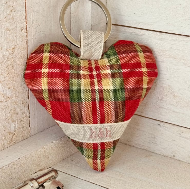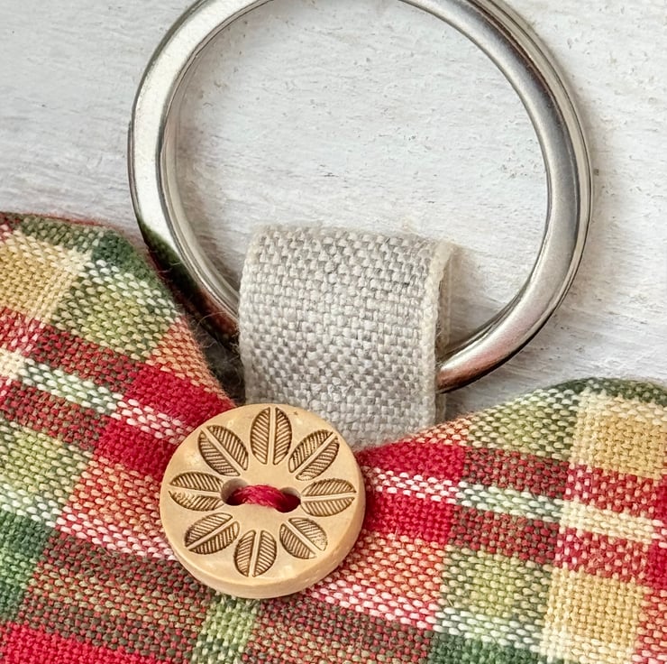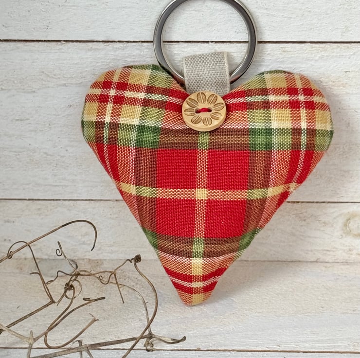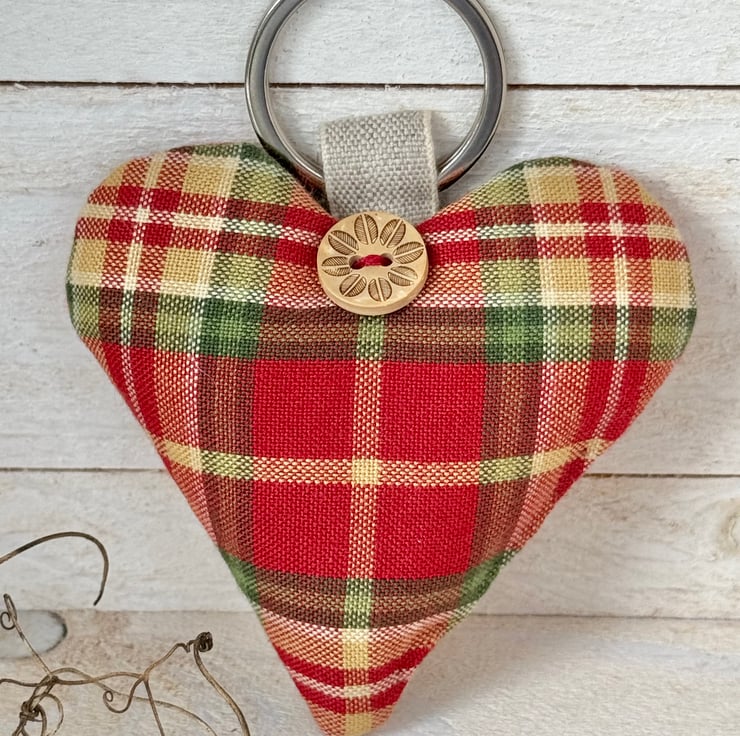 Mellow autumnal hues of russet, moss green and ochre combine in this heart-shaped tartan key ring, generously filled with lavender or with hypoallergenic wool toy stuffing, and beautifully finished with a flower-etched wooden button, and a stainless steel split ring attached with a linen tape loop.