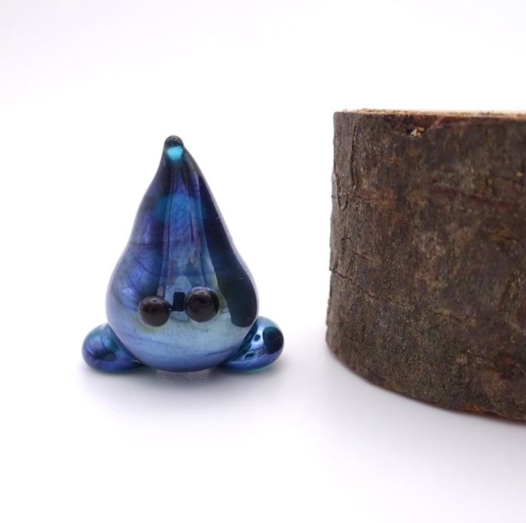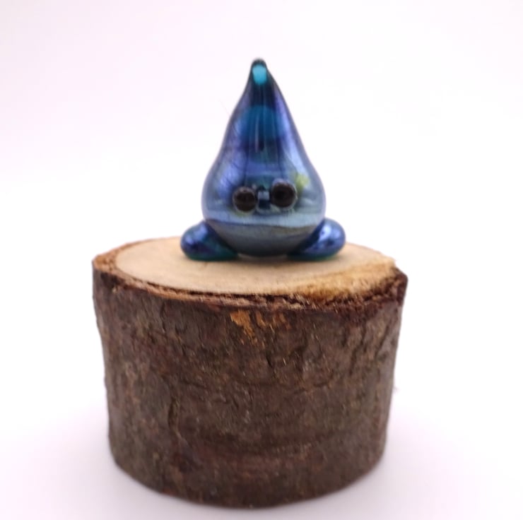 A small glass wisp figure made by hand using a technique called lampworking.