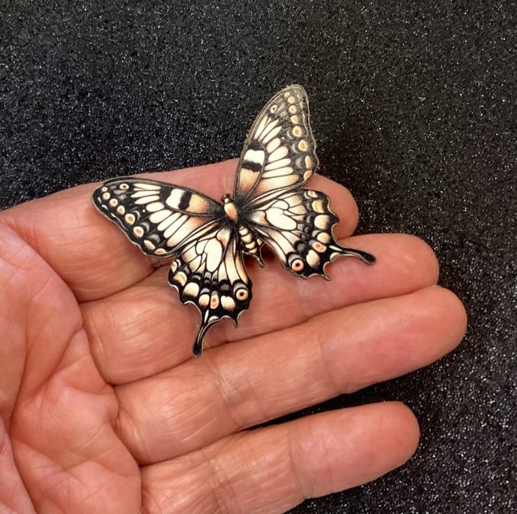 A beautiful brooch with a butterfly with lacelike wings, is captured to give pleasure for years.