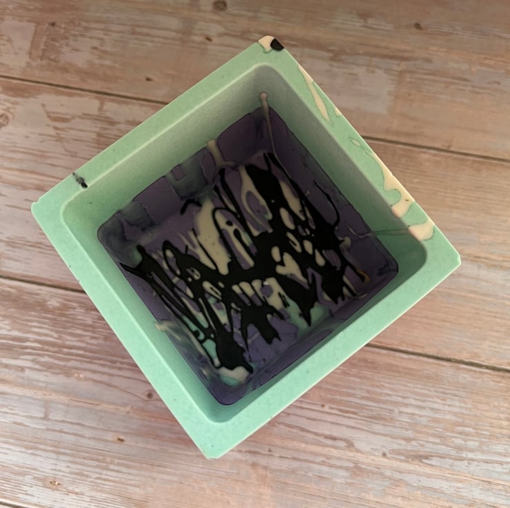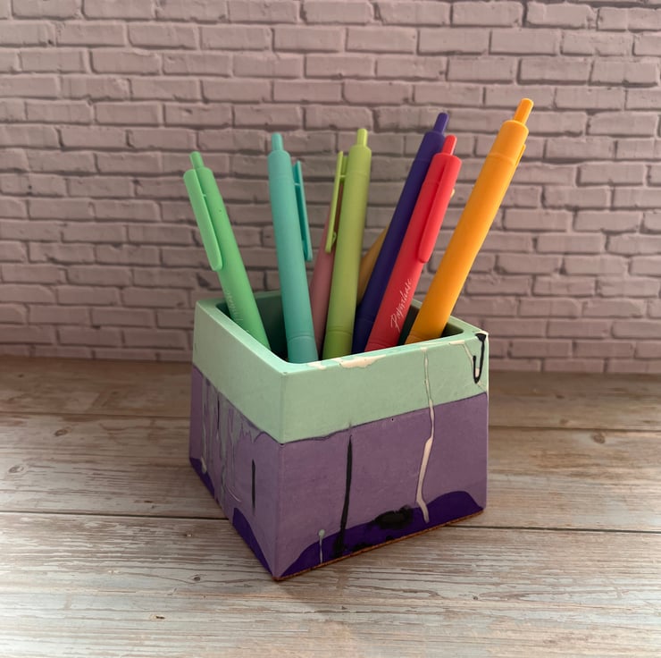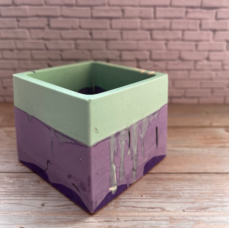 This small handcrafted Jesmonite pot is a gentle burst of colour and calm. Starting with a deep, velvety purple at its base, the hues soften upward into lilac tones before blooming into a fresh peppermint green—like dusk melting into spring. Tiny flecks of black add a touch of contrast, hinting at the spontaneity of handmade magic.