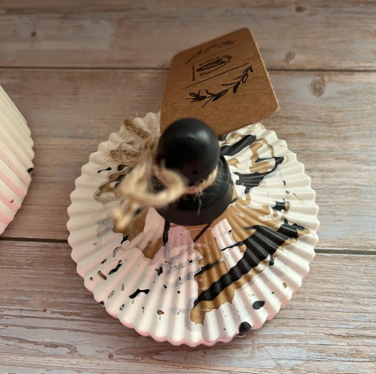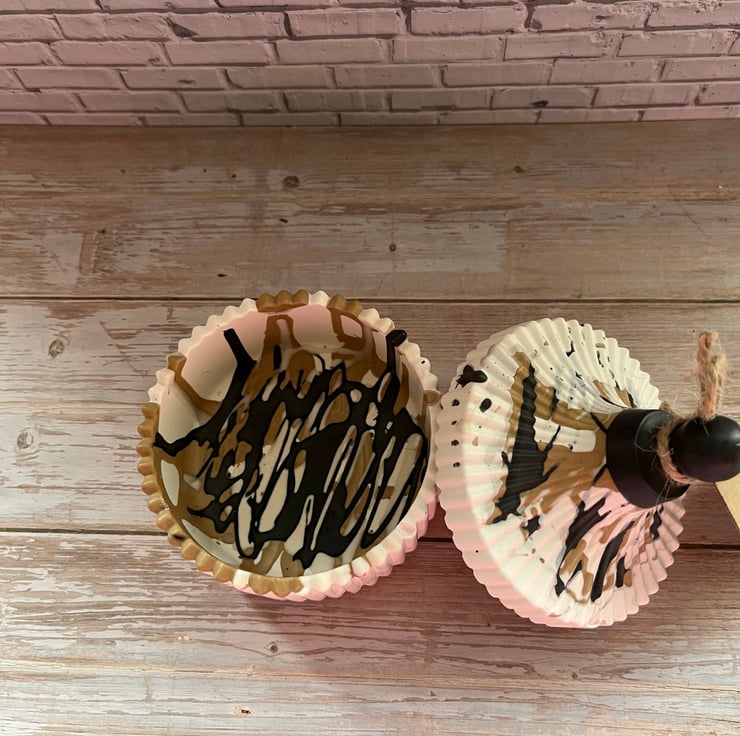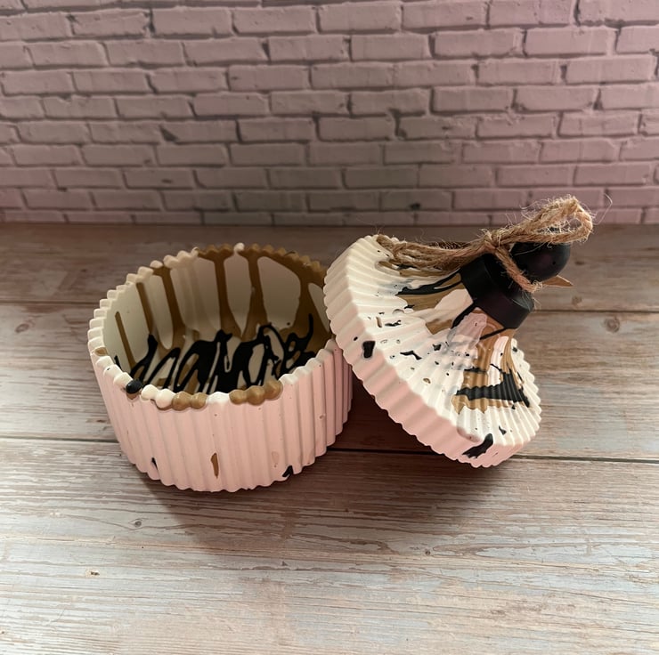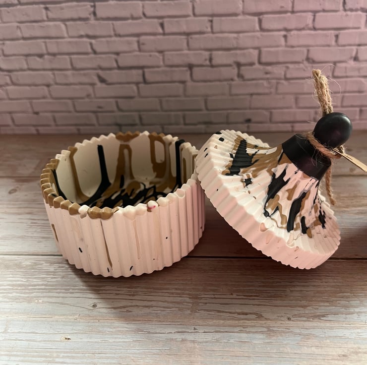 This striking Jesmonite trinket box blends raw texture with urban elegance. Its crisp white base sets the stage for a bold graffiti-inspired pattern in black and earthy brown—each mark a celebration of contrast and individuality. The rigid surface adds a tactile edge, making it as intriguing to hold as it is to behold.