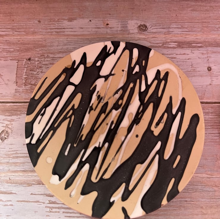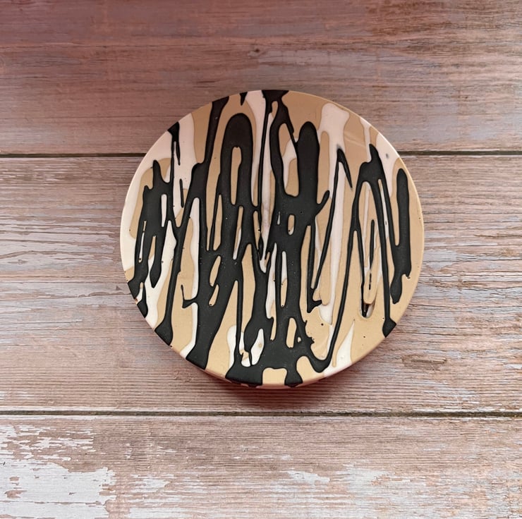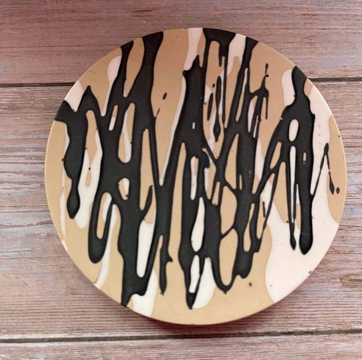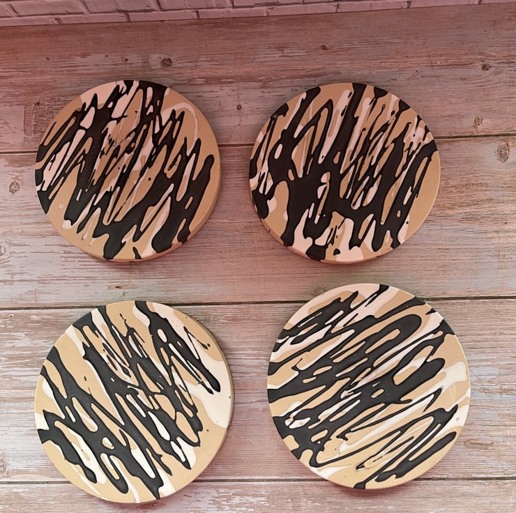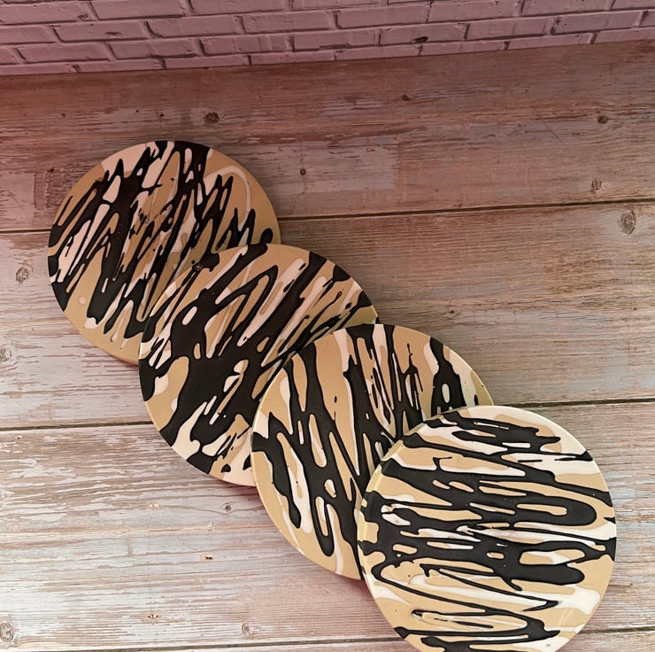 This striking set of four Jesmonite coasters brings a bold, urban edge to your home. Each piece features a rich brown base layered with black and white graffiti-style accents—an artful clash of texture and tone that feels both modern and grounded. The pattern is spontaneous yet balanced, making every coaster a unique expression of contrast.