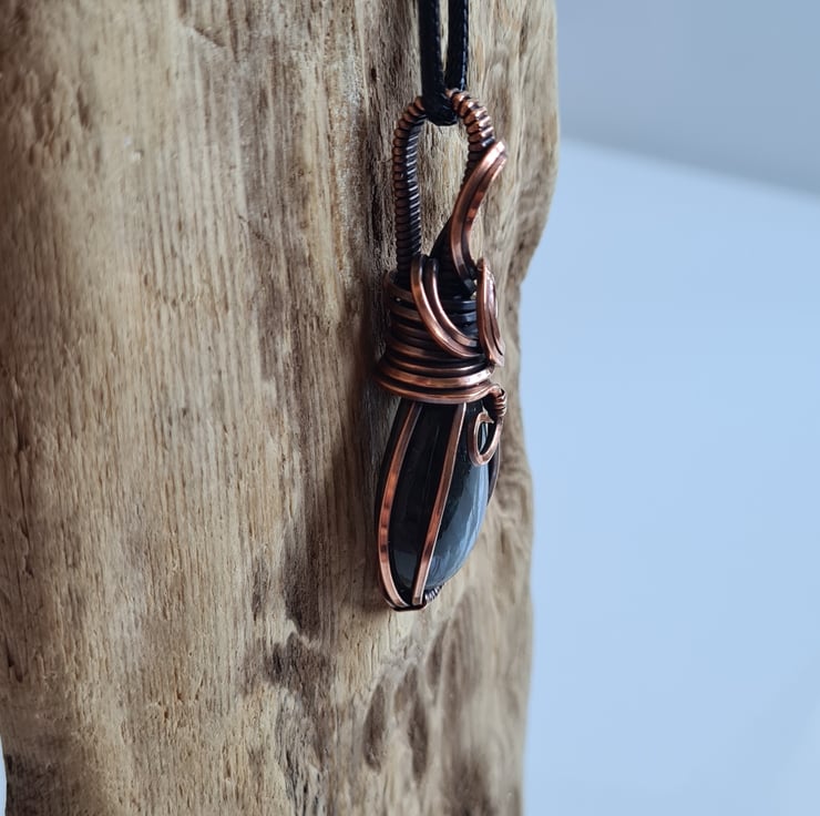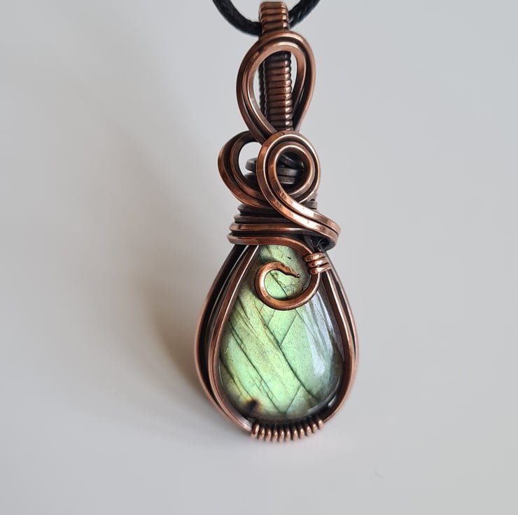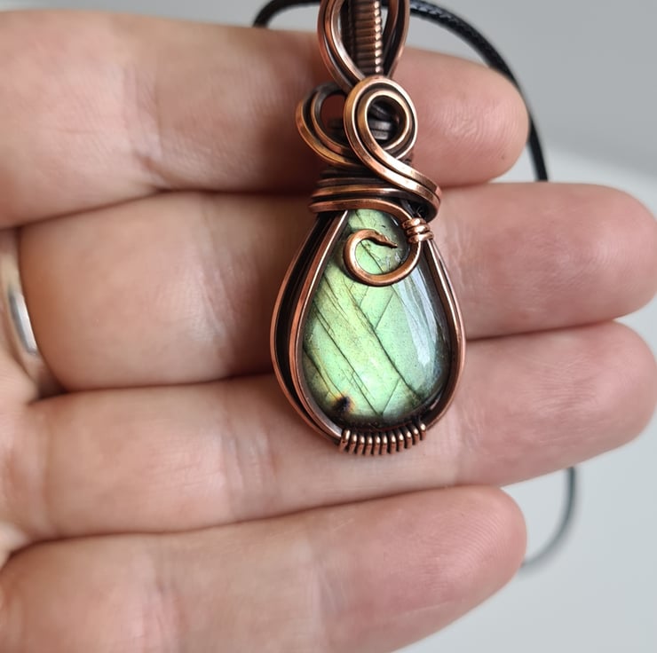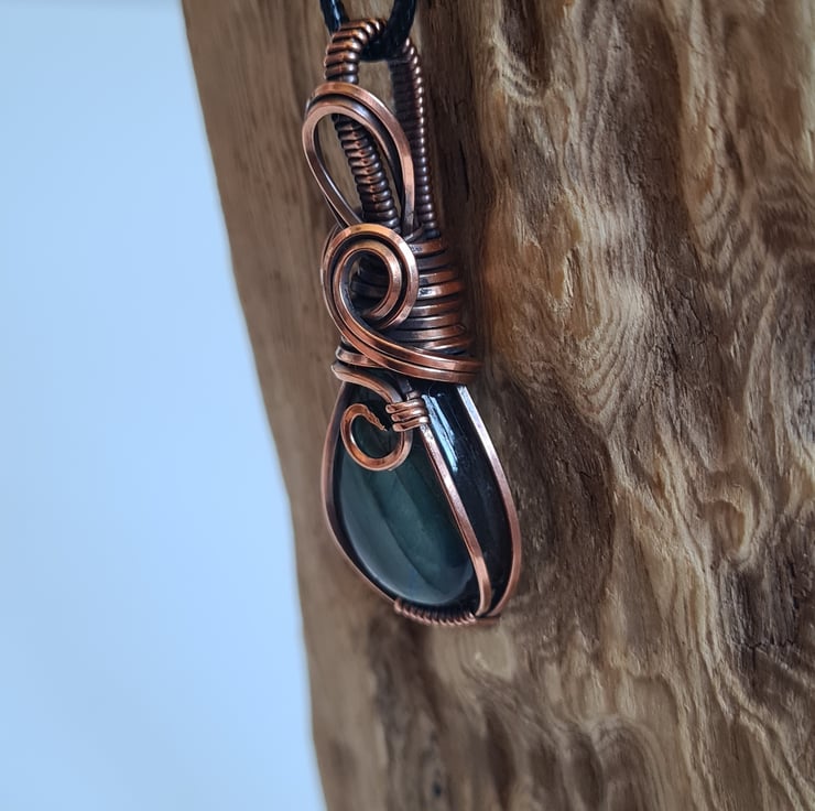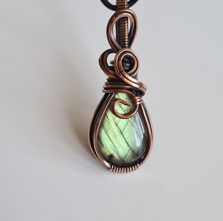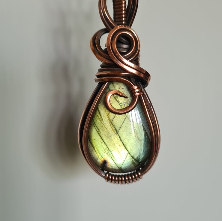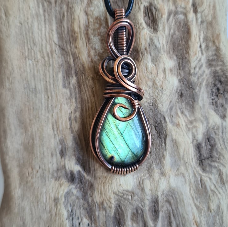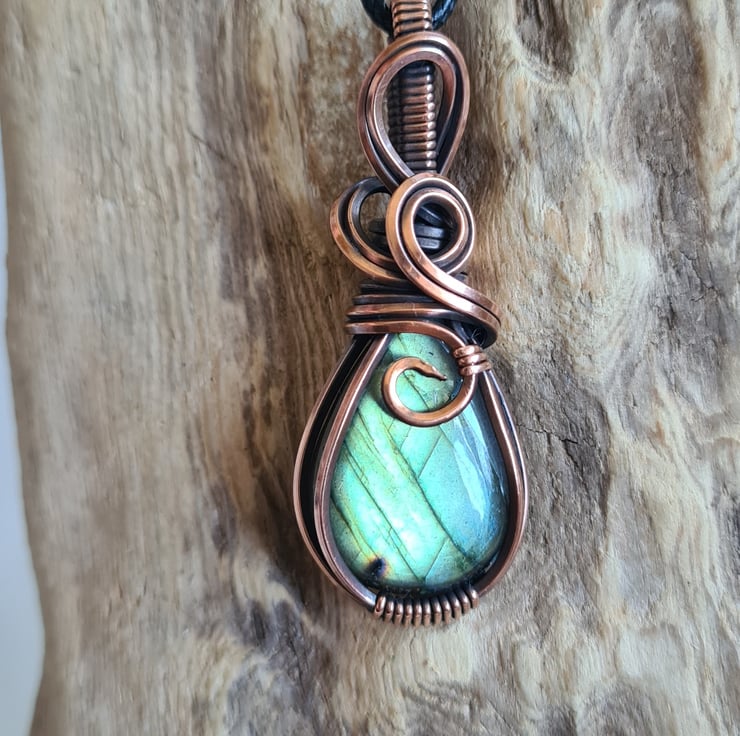 This lovely Natural Labradorite crystal is a beautiful green colour and I have wrapped it with copper into this unique design and then antiqued and polished for the final effect. This labradorite has a lovely energy and feel to it, looks amazing against the copper, and is a ideal unique, one of a kind gift.