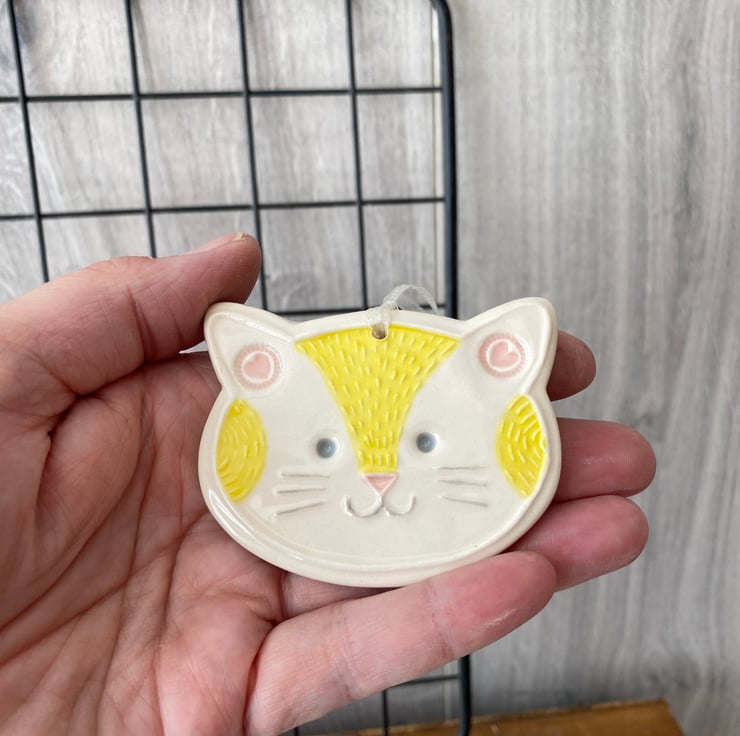 This cute little pottery cat has been hand-cut and stamped from my own design. It is made from white earthenware clay, decorated and fired. It has then been glazed with a lovely glossy glaze and fired again to 1100 degrees. It hangs from a cream organza ribbon. 7cm wide x 5.5cm high x 0.8cm deep.
