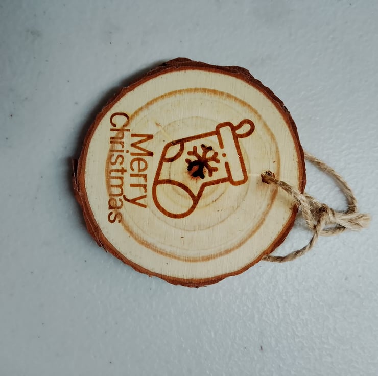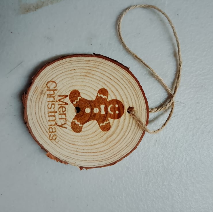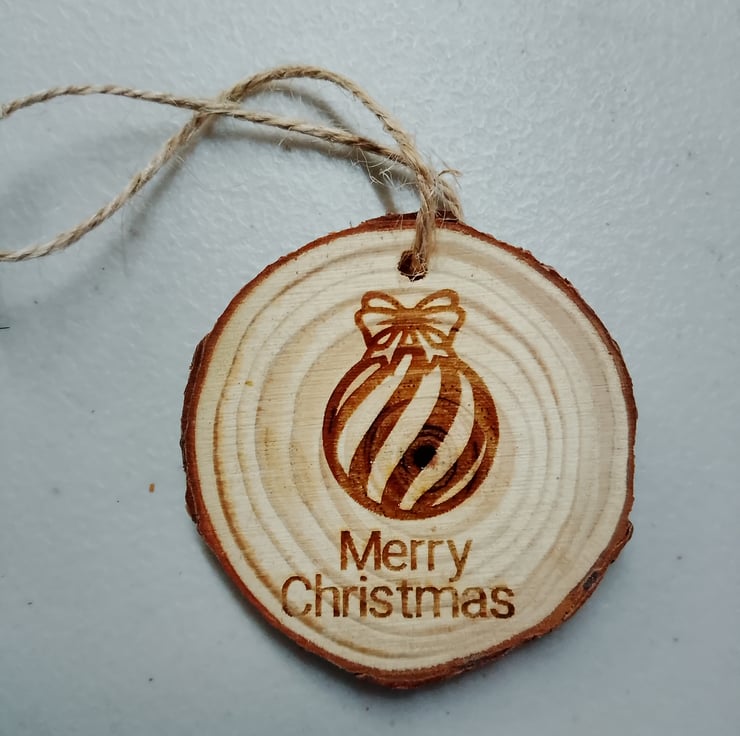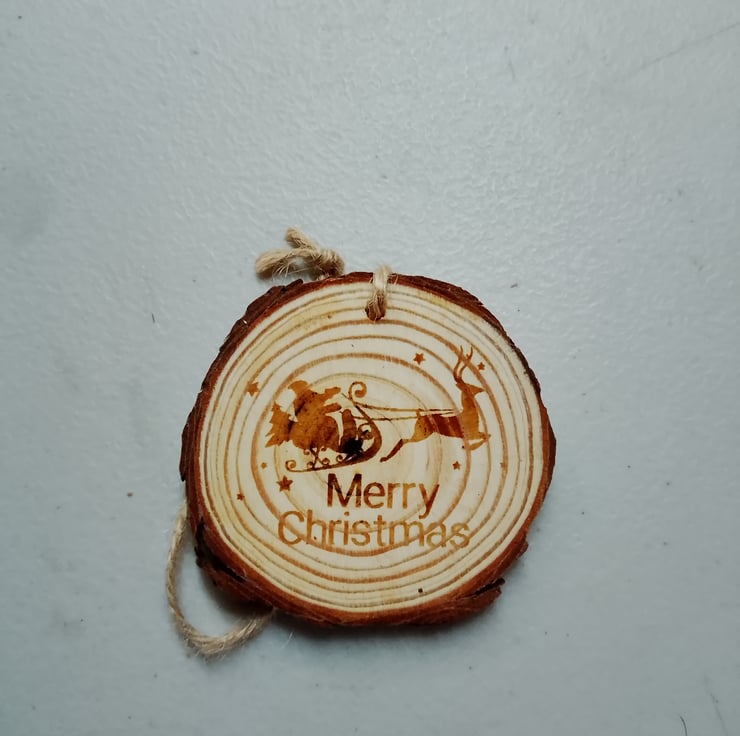 Beautiful natural wooden Christmas tree decorations set of 6 each one has a picture of: