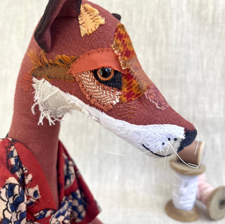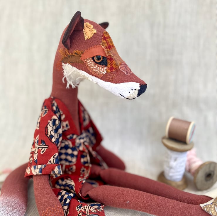 Rowan the Fox is a handcrafted textile heirloom doll.