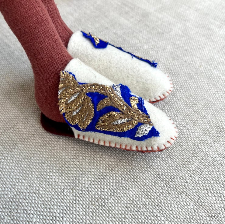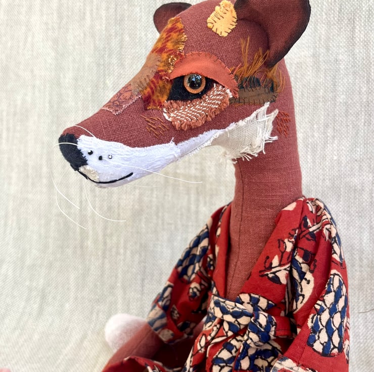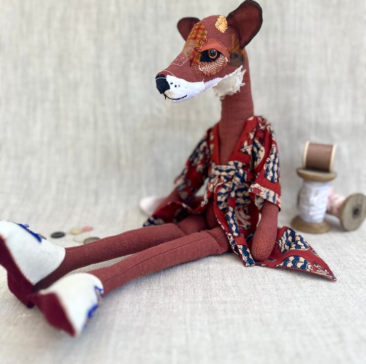 Rowan is wearing a batik fabric robe and embellished felt slippers- a rather dashing fox!