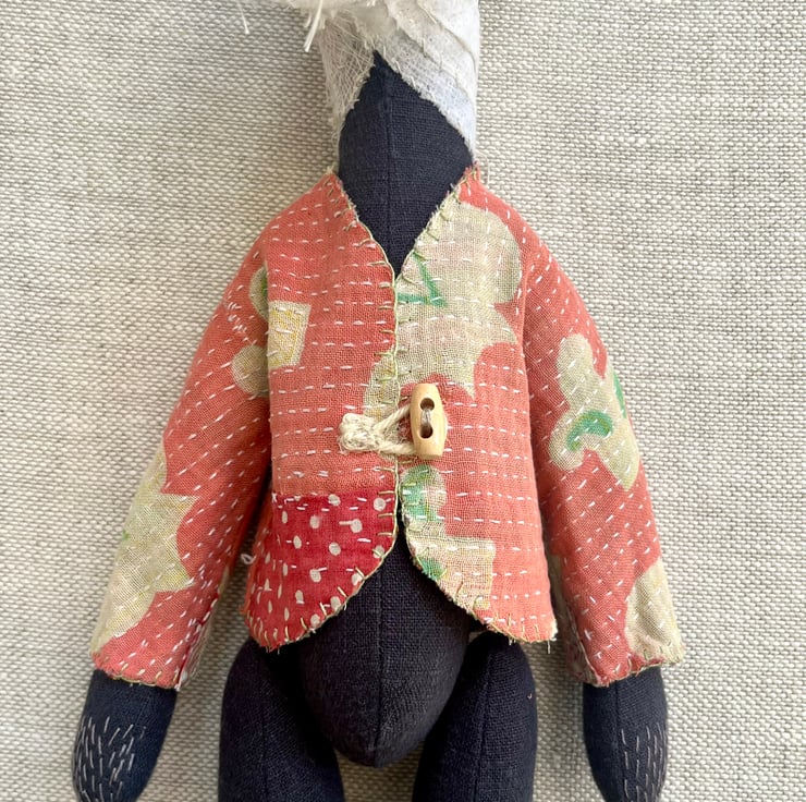 The stripes on her face are made from recycled scraps of fabric: linen, lace and silk, and stitched in place with a cotton thread.