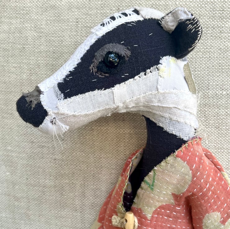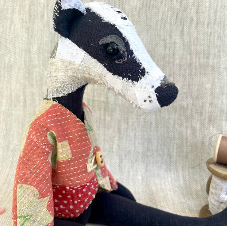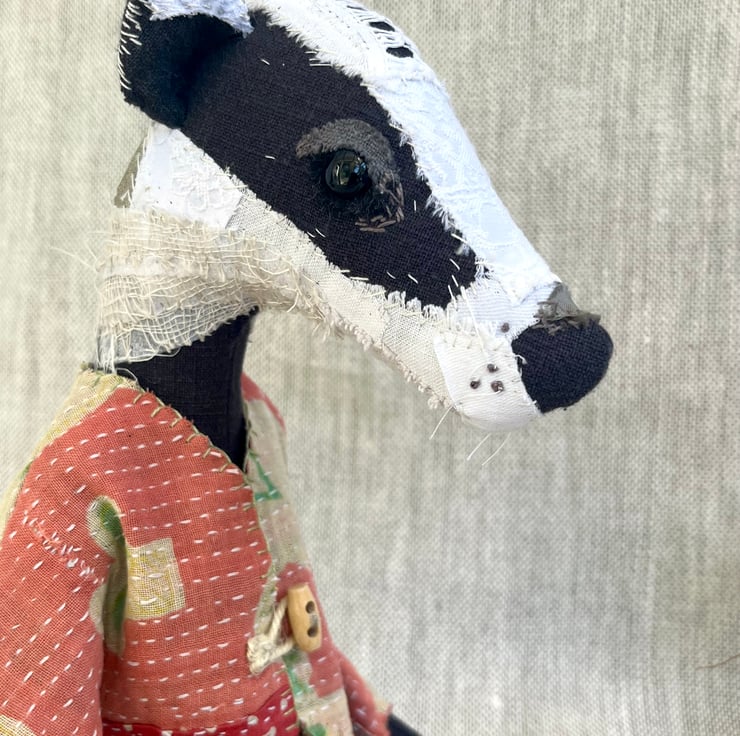 Brooke the Badger is a handcrafted textile heirloom doll.