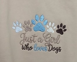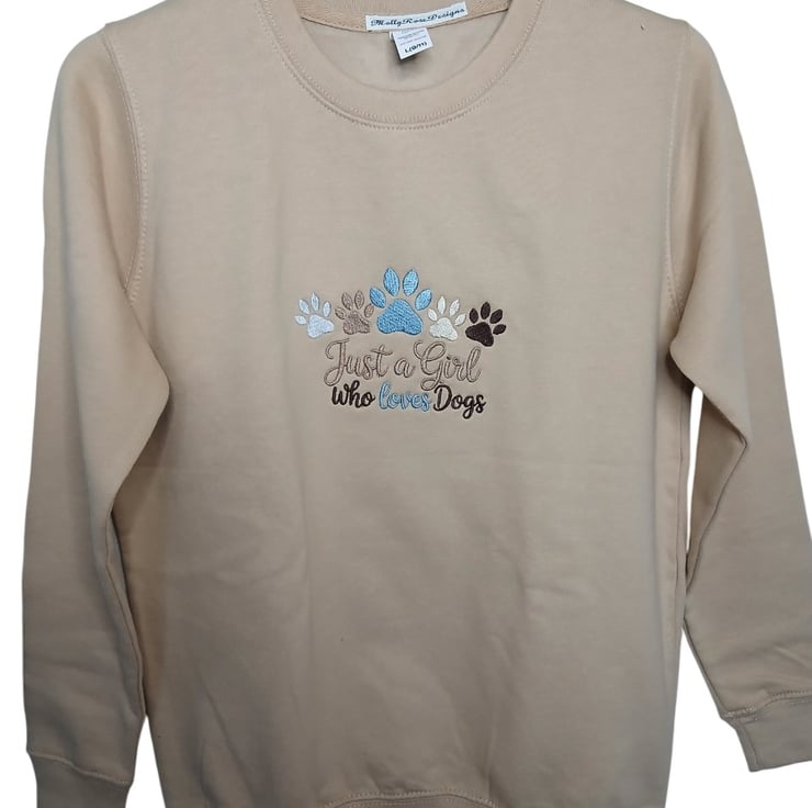 This is a machine embroidered dark beige sweatshirt. Girl size 9-11 years. Light fleece on inside with ribbed collar and cuffs.