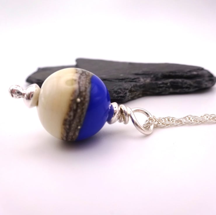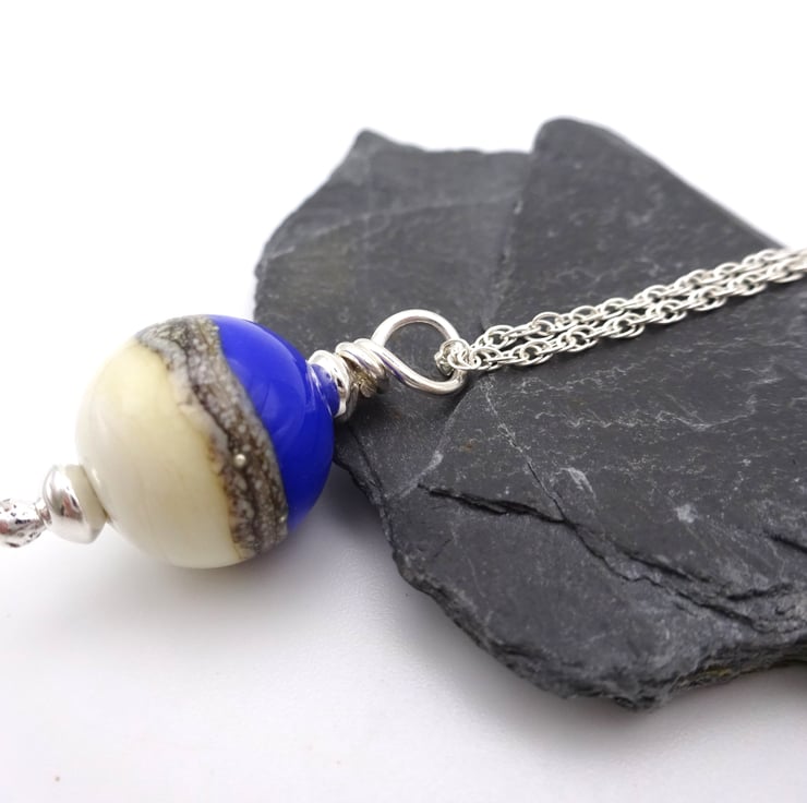 A sterling silver chain strung with a handmade lampwork glass pendant bead. The bead has been made with ivory and blue glass and shaped into a sphere.