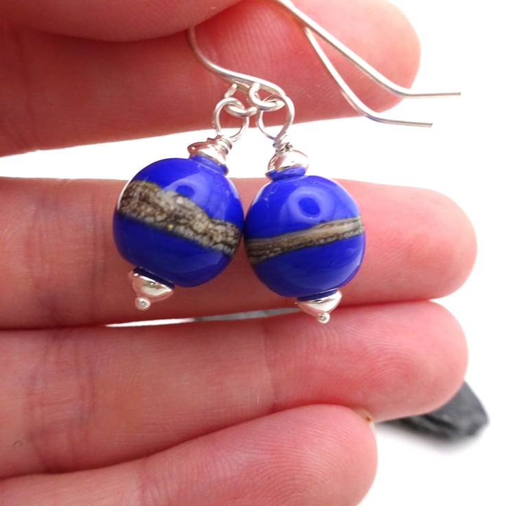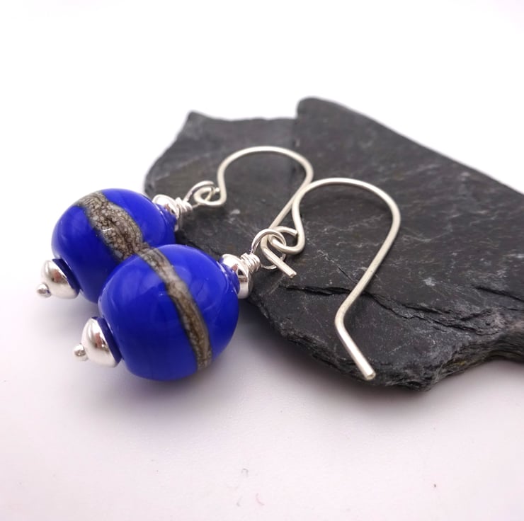A pair of sterling silver earrings which feature blue handmade lampwork glass beads which have been wrapped with a band of silvered glass.
