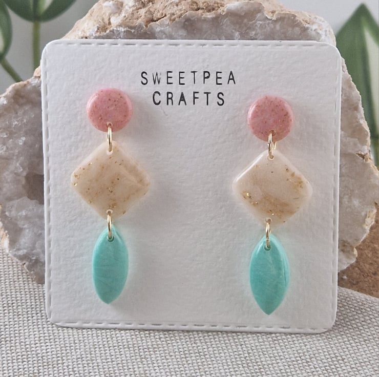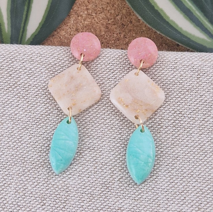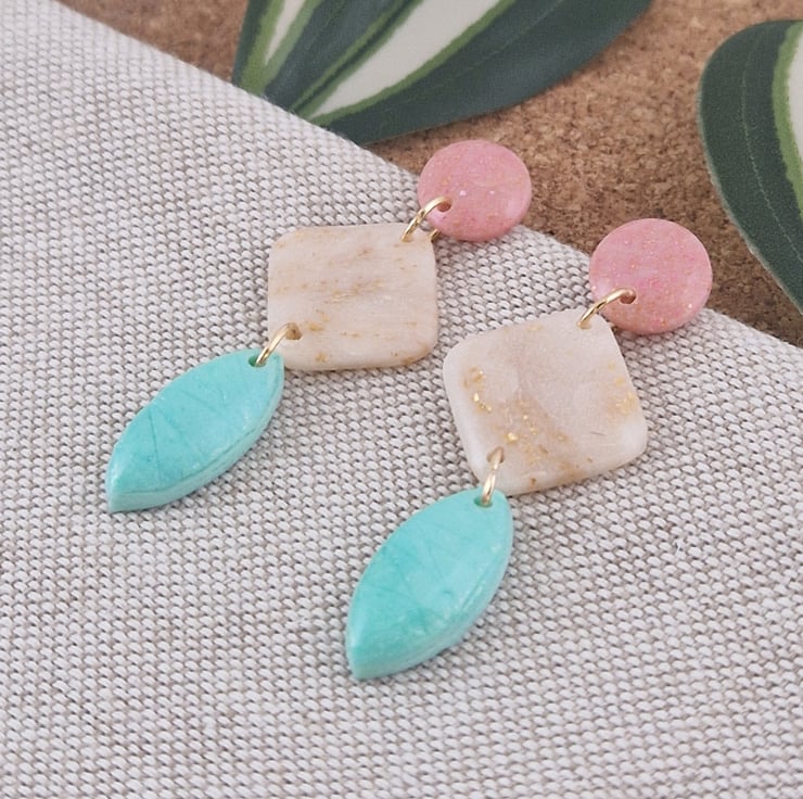Handmade with care, these dangle earrings are crafted from lightweight polymer clay, making them comfortable enough to wear all day. Each pair is unique, no two are exactly the same, giving you a truly one-of-a-kind accessory. Approximately 50mm long. Hypoallergenic studs.
