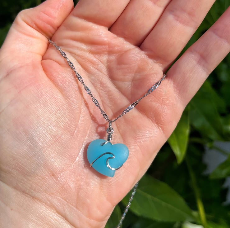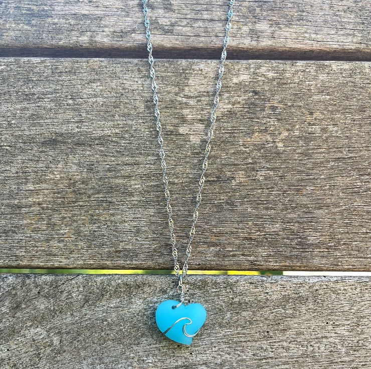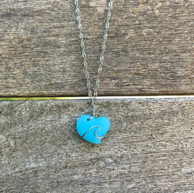 Cute heart shaped cultured sea glass with wave wire design. Made with stainless steel (tarnish resistant).