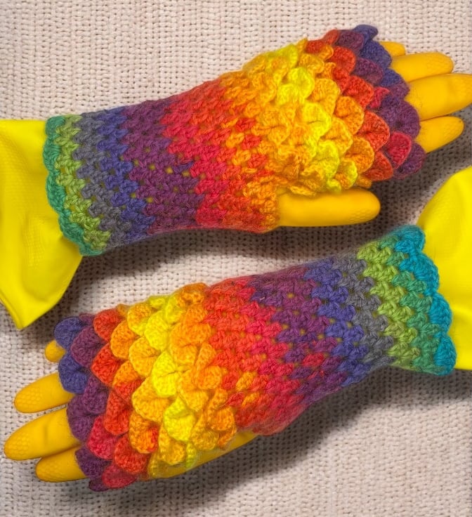 I was watching YouTube and saw a video for these gloves. The stitching intrigued me as I had not made anything using the crocodile stitch before, so I decided to have a go at it. They were quite enjoyable to make, so much so that I keep making pairs of them.