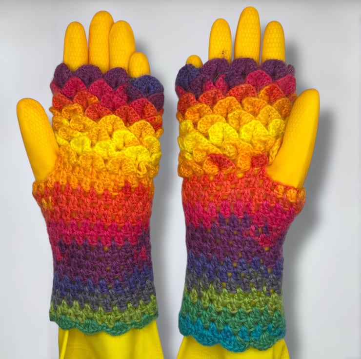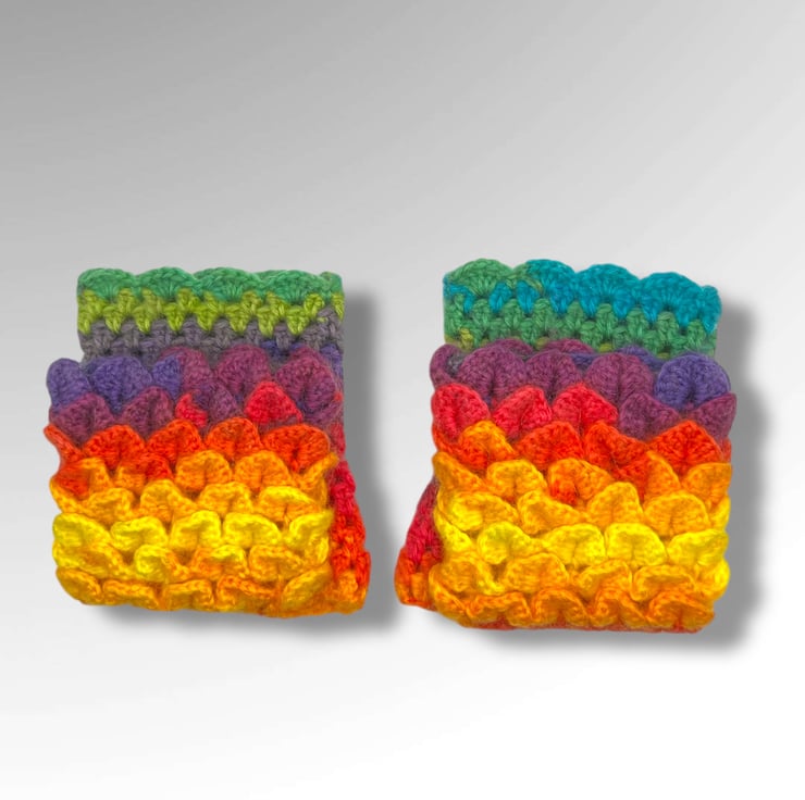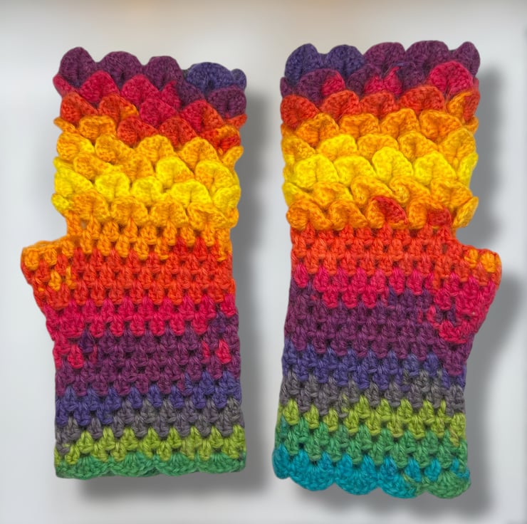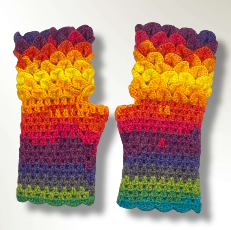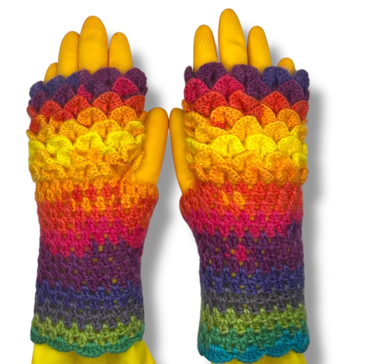 The gloves have been handmade in my hometown of Llandrindod Wells. They have been crocheted with a beautiful mix of red, orange, yellow, green, blue and purple colours that remind me of a rainbow. They are size Large. The measurements are 8.5 cm from top to thumb, and 21 cm length in total. The gloves do stretch a bit and so the finger hole diameter is approximately 18 - 21 cm and the arm hole diameter is approximately 19 - 22 cm.