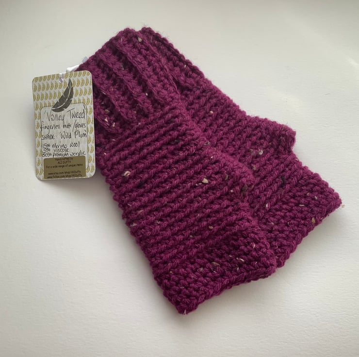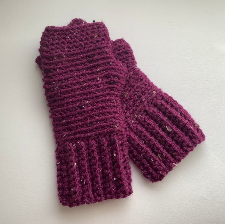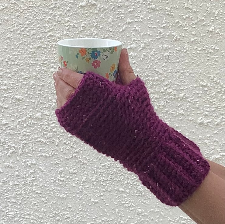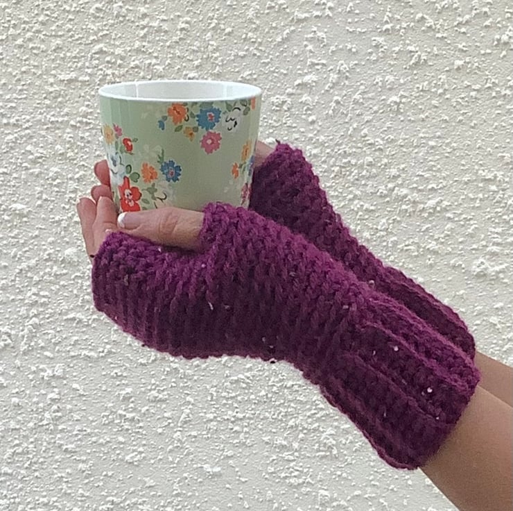 I have designed and crocheted these fingerless mitts / texting mitts ' Valley Tweed ', using a lovely , chunky ( yet lightweight ) Merino wool blend . I've created a relaxed but stretchy wrist section for comfort . They are pretty , practical , warm and cosy.