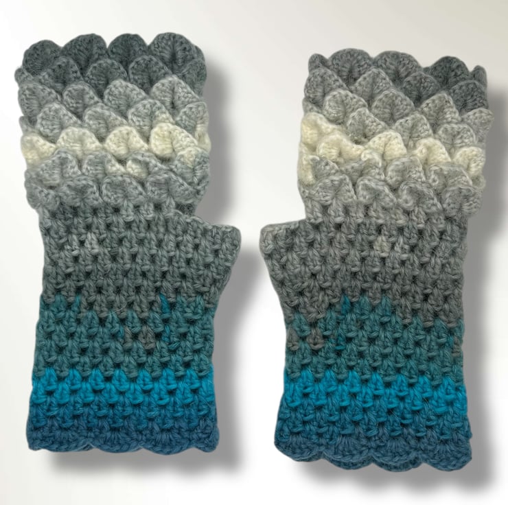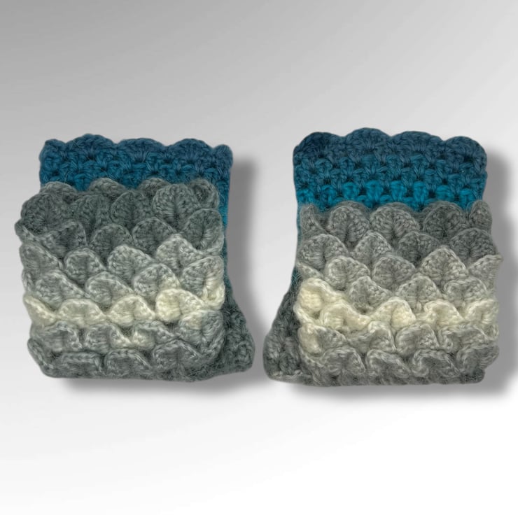 These crocheted fingerless gloves have been made from a 80% Acrylic, 20% Wool yarn. The top part of the gloves is made with a lovely dragon scale stitch. They are nice and cosy for those chilly days, but offer the flexibility of having your fingers free to perform fiddly tasks.