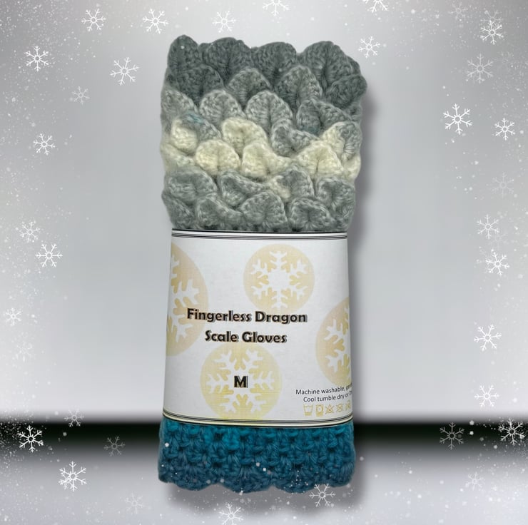 The gloves have been handmade in my hometown of Llandrindod Wells. They have been crocheted with a beautiful mix of blue, grey, and white colours that remind me of a glacier. They are size Medium. The measurements are 8 cm from top to thumb, and 19 cm length in total. The gloves do stretch a bit and so the finger hole diameter is approximately 17 - 19 cm and the arm hole diameter is approximately 17 - 20 cm.