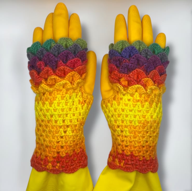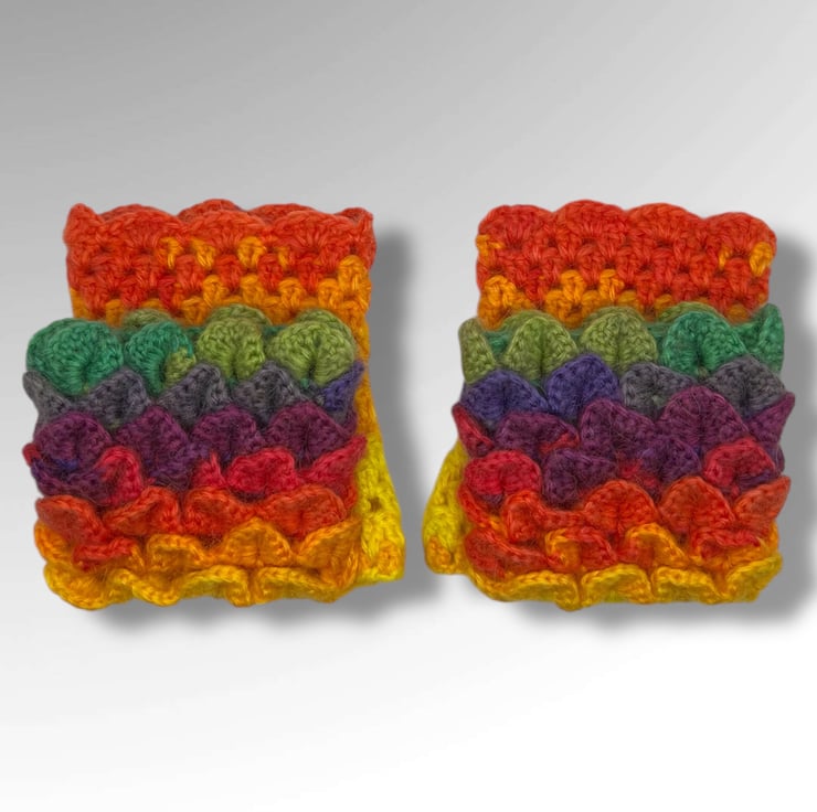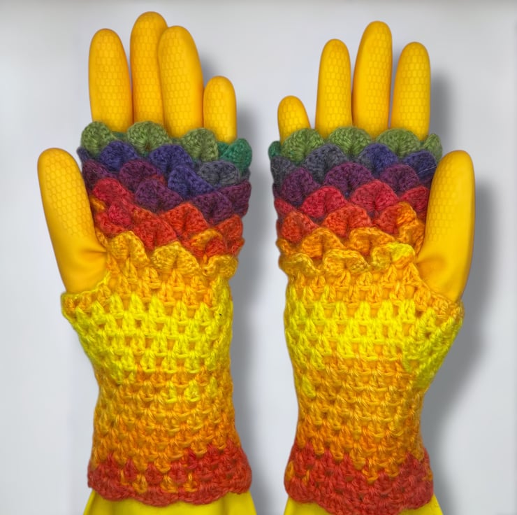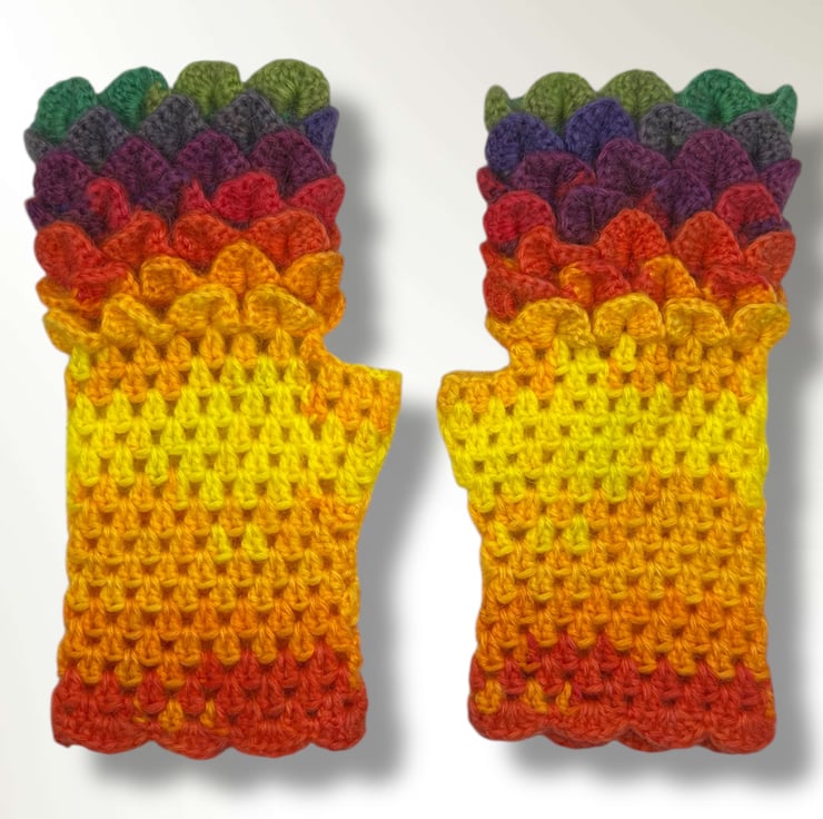 The gloves have been handmade in my hometown of Llandrindod Wells. They have been crocheted with a beautiful mix of red, orange, yellow, green, blue and purple colours that remind me of a rainbow. They are size Medium. The measurements are 7.5 cm from top to thumb, and 18.5 cm length in total. The gloves do stretch a bit and so the finger hole diameter is approximately 17 - 19 cm and the arm hole diameter is approximately 17 - 20 cm.