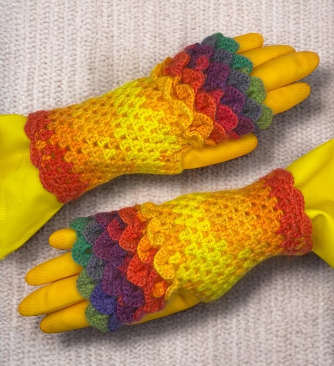 I was watching YouTube and saw a video for these gloves. The stitching intrigued me as I had not made anything using the crocodile stitch before, so I decided to have a go at it. They were quite enjoyable to make, so much so that I keep making pairs of them.