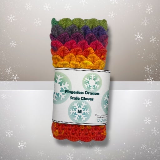 These crocheted fingerless gloves have been made from a 80% Acrylic, 20% Wool yarn. The top part of the gloves is made with a lovely dragon scale stitch. They are nice and cosy for those chilly days, but offer the flexibility of having your fingers free to perform fiddly tasks.