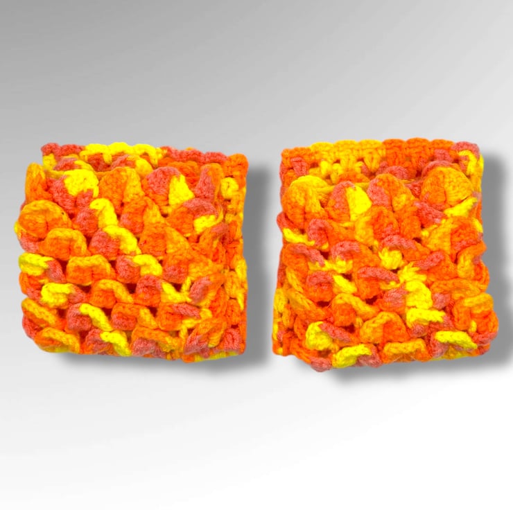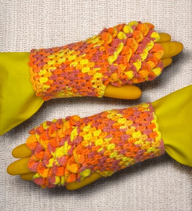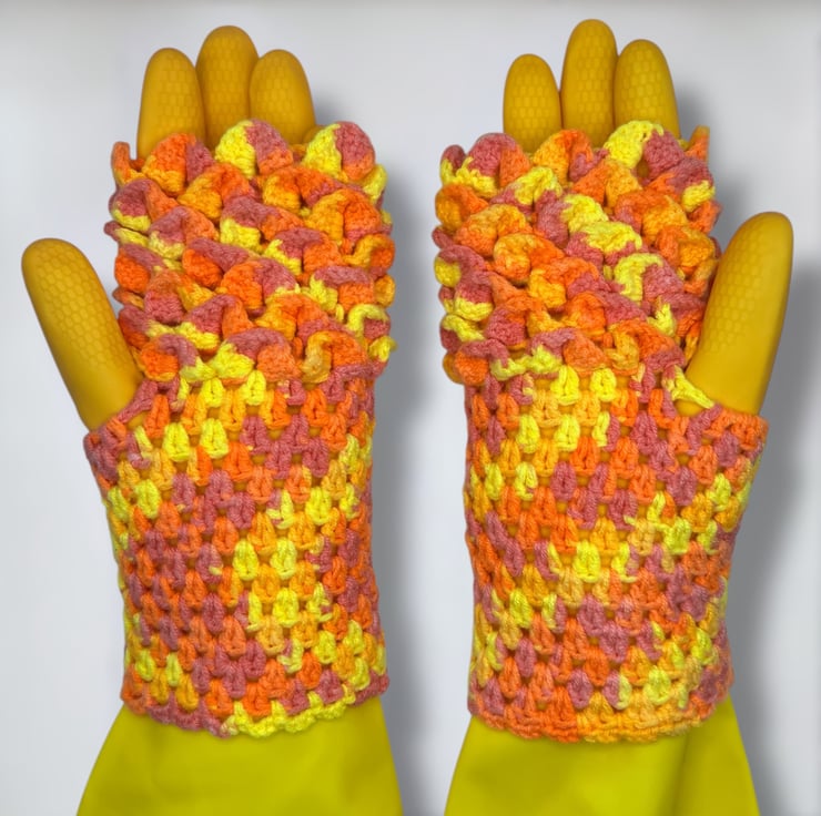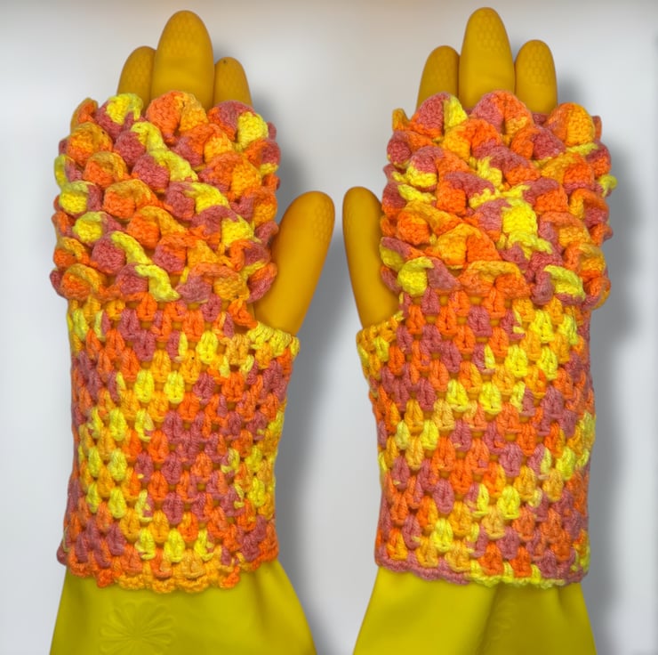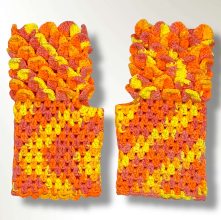 The gloves have been handmade in my hometown of Llandrindod Wells. They have been crocheted with a beautiful mix of orange and yellow colours that remind me of the sunshine. They are size Medium. The measurements are 7.5 cm from top to thumb, and 18 cm length in total. The gloves do stretch a bit and so the finger hole diameter is approximately 17 - 19 cm and the arm hole diameter is approximately 21 - 23 cm.