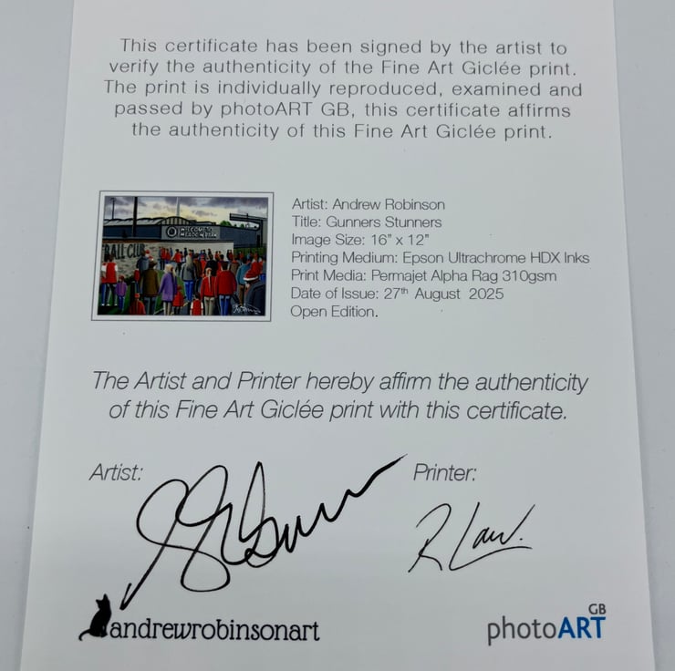 The framed print comes with a 'Certificate of Authenticity' which documents the details of the original painting and the art print. The Certificate of Authenticity is affirmed with a signature from both myself (the artist) and the printer.