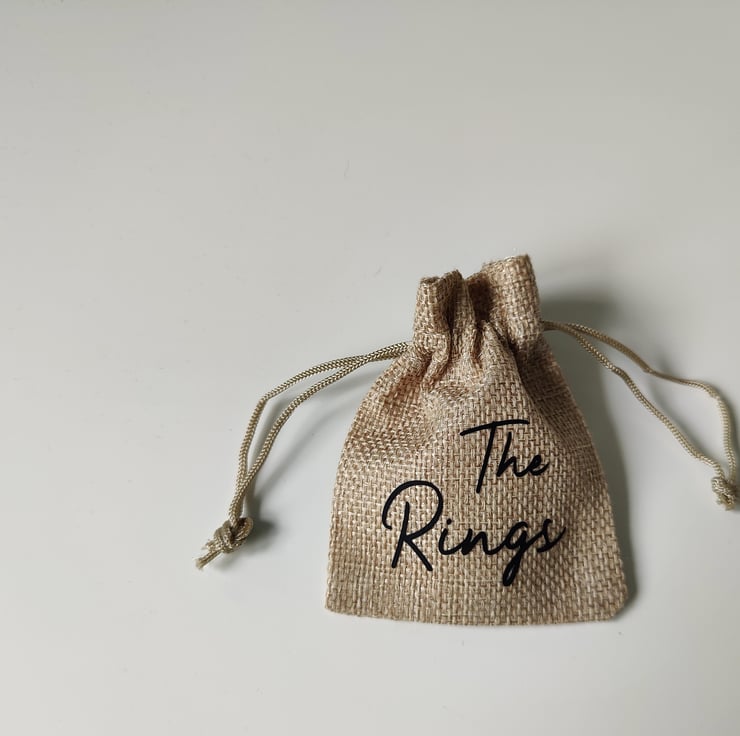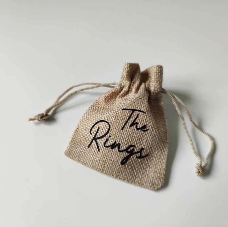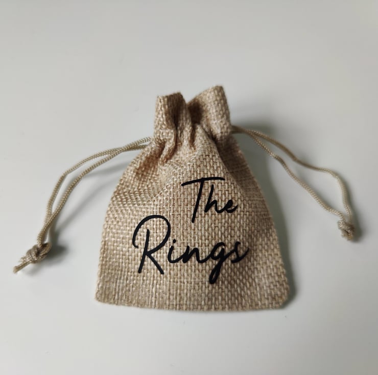 A cute jute pouch that has a natural, rustic feel with a drawstring top and 'The Rings' text in a high quality black HTV.