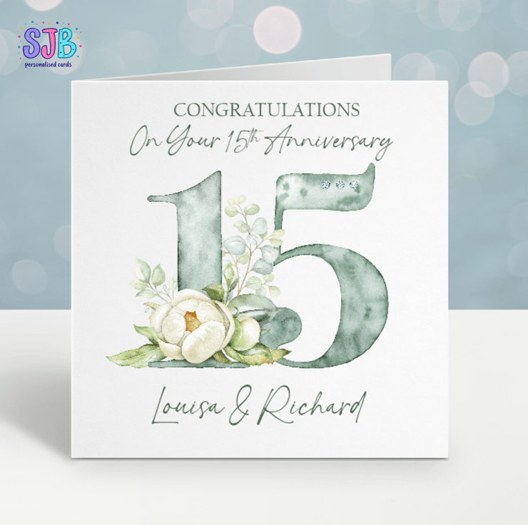 A handmade personalised 15th anniversary card, finished with diamantés on the '5'