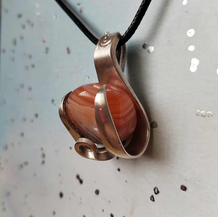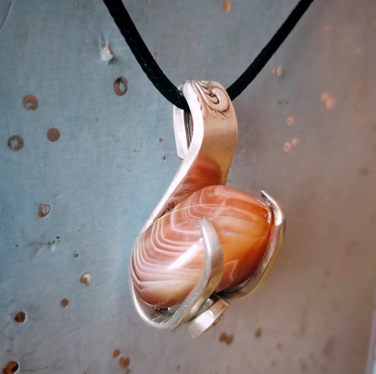 A lovely polished Botswana agate held naturally within a silver plated vintage fork. Handmade, upcycled and given a new lease of life.
