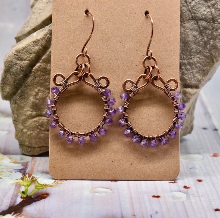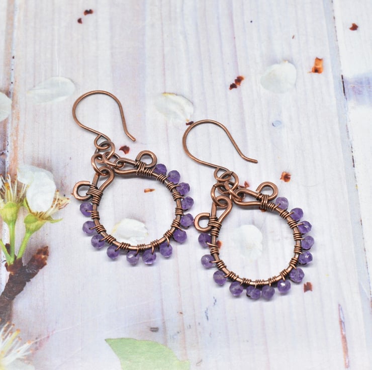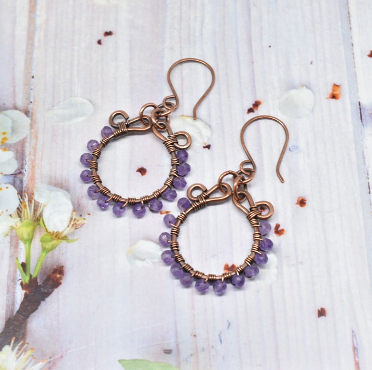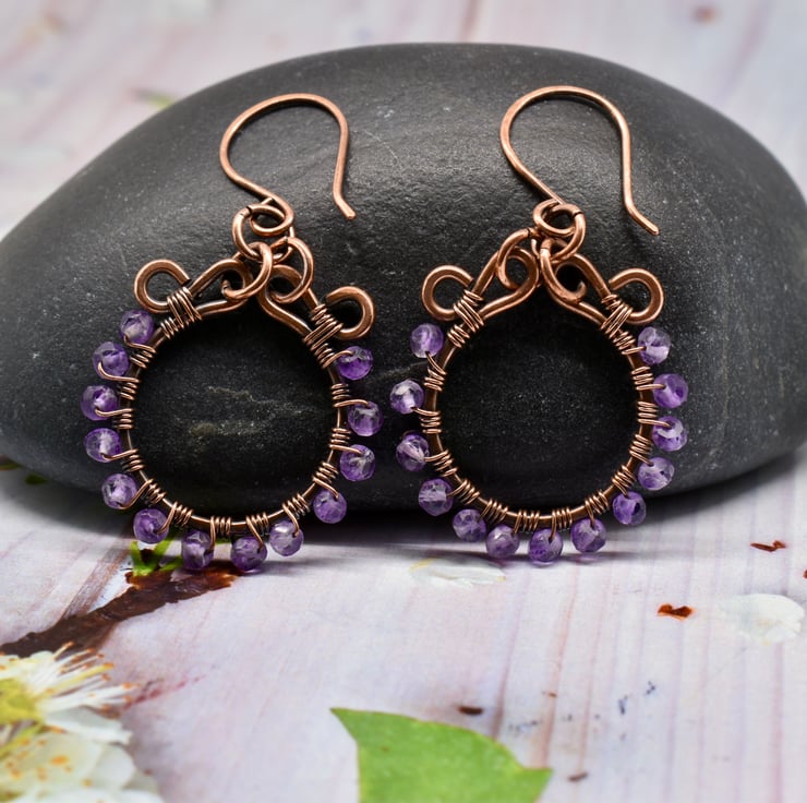 These pretty hoop earrings have been completely made by hand. I have formed the copper hoops, added the purple amethyst beads using fine copper wire and completed them with handmade copper ear wires.