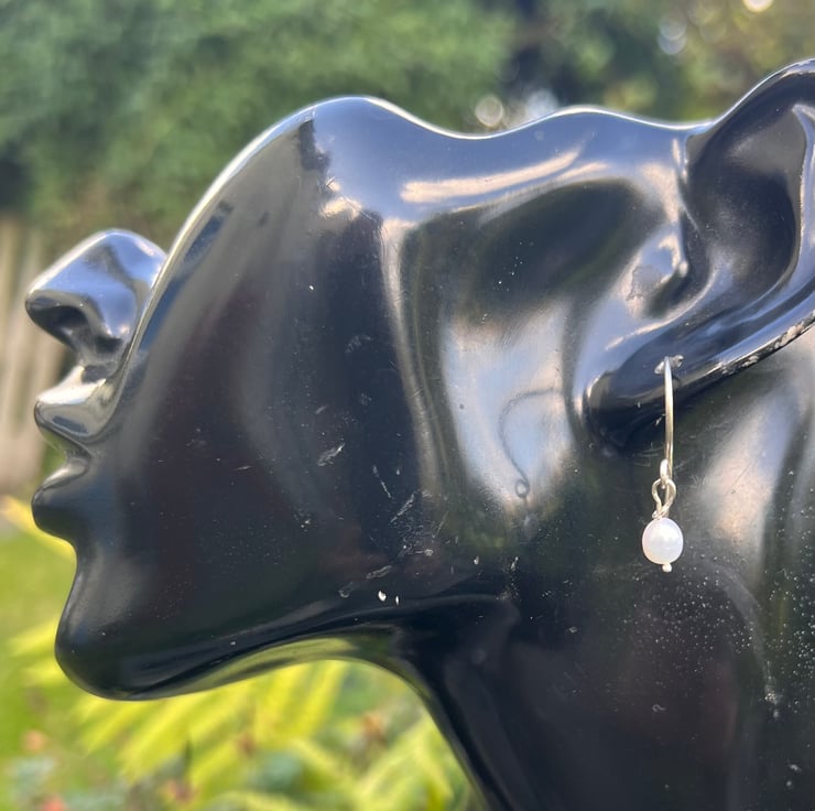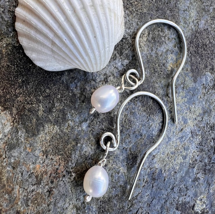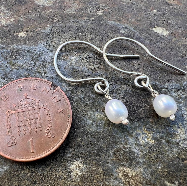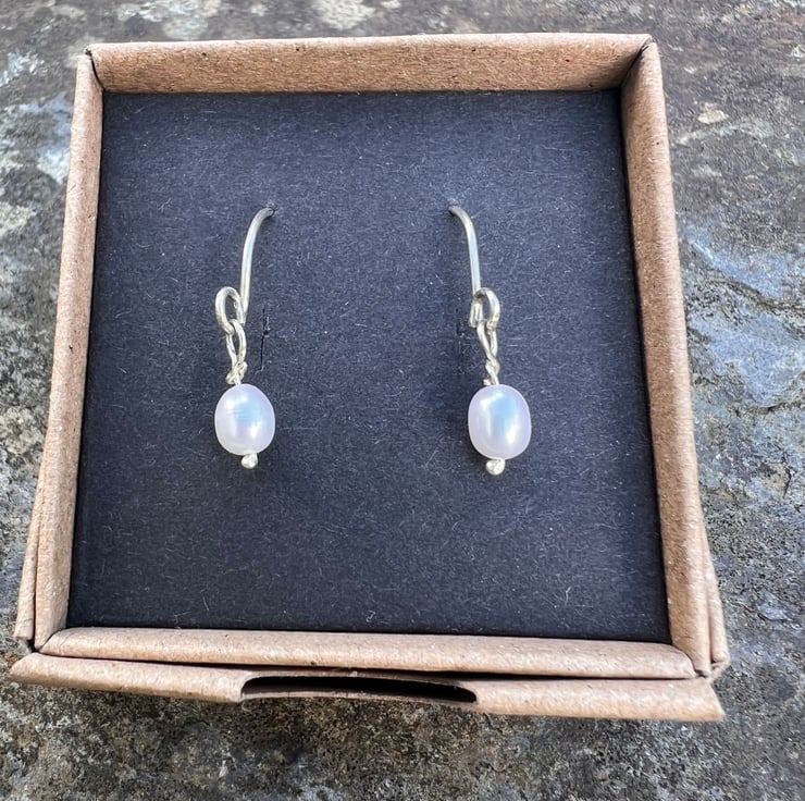 Earrings made from eco sterling silver wire, with a dangly freshwater pearl. The freshwater pearls are 5mm in diameter and 6mm long. The total dangle is 25mm/ 1inch .Presented in a recycled cardboard gift box; tied with paper raffia, ready to gift and posted in plastic free recycled brown paper packaging.