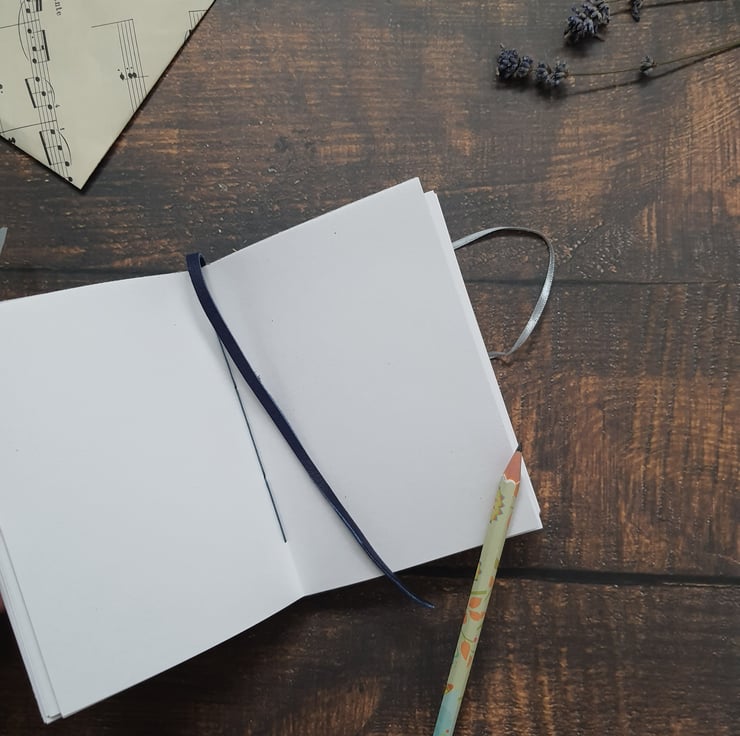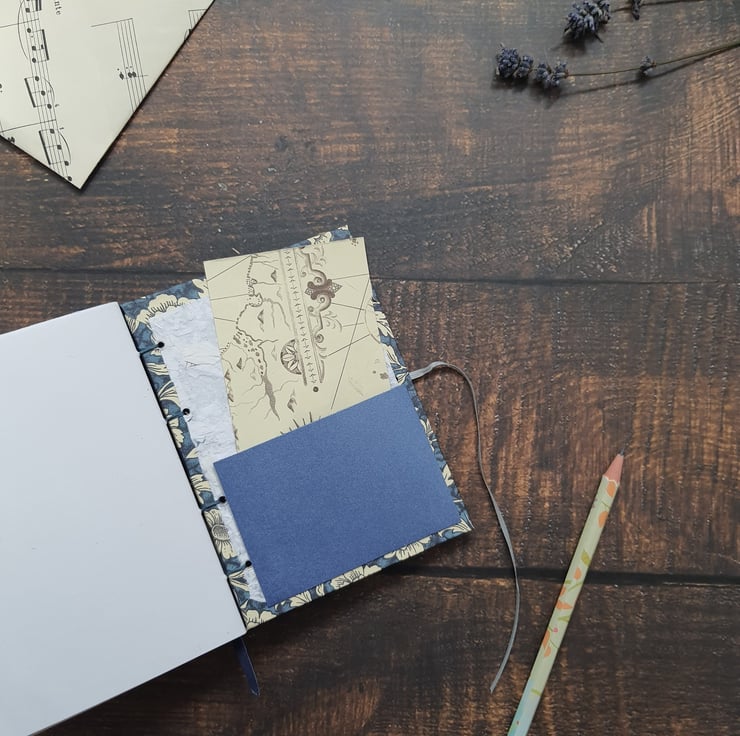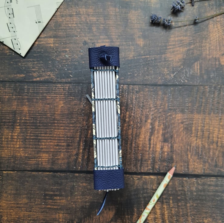 This hand-bound notebook has solid floral covers in blue and cream, with an open spine showing the pretty blue stitching. Blue leather details have been added to the spine to complement the colour scheme. A leather cord is fastened to the spine to use as a page marker, while ribbons have been attached to ties the journal closed. There's also a small pocket on the inside back cover.