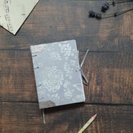 Handmade floral cover A6 journal or notebook, with Coptic stitching and leather details on the spine.