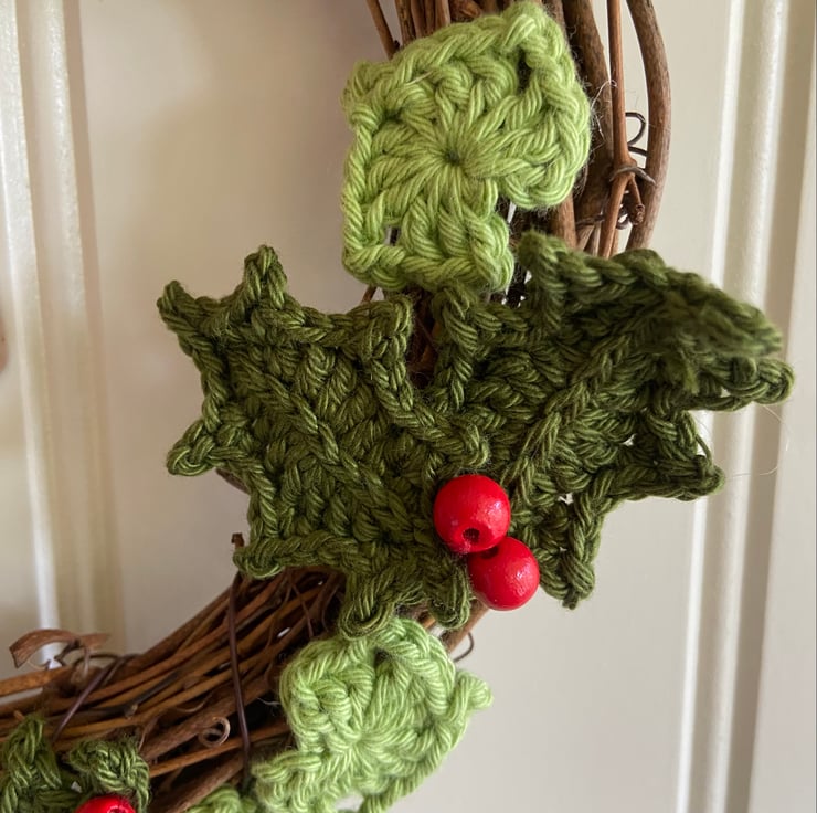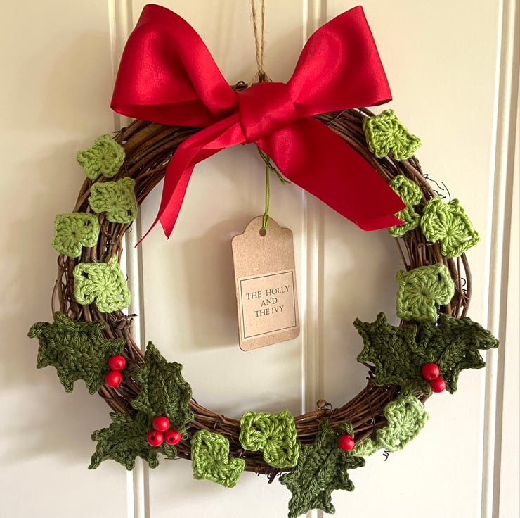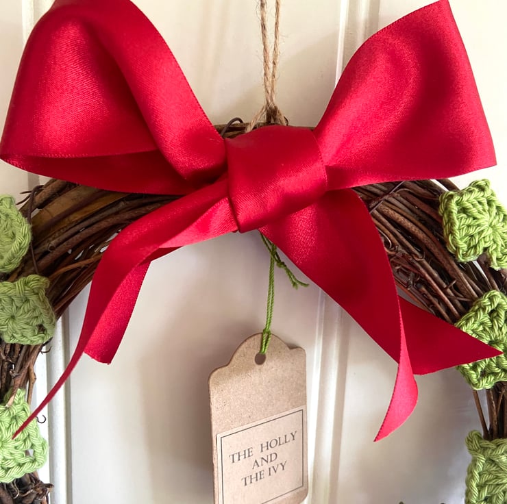 This diminutive wreath measures approximately 22 cm in diameter and is covered in crochet cotton holly and ivy leaves and topped with a red satin bow. The holly leaves are from a pattern by Lucy at Attic24 and they have been finished with hand-sewn painted wooden beads for berries. The red satin bow is glued in position and there is a jute hanging loop. The tag reads, The Holly and the Ivy on one side and is blank on the other for your own greeting.