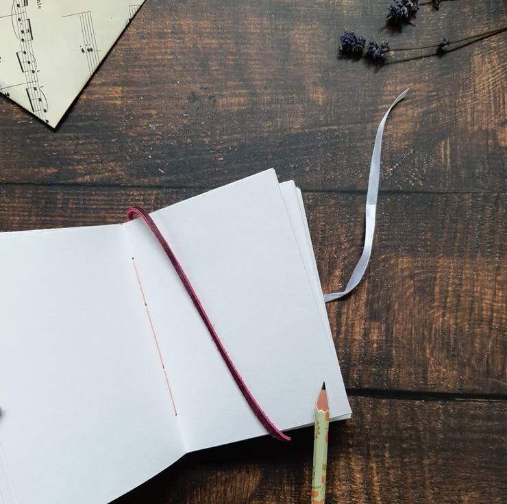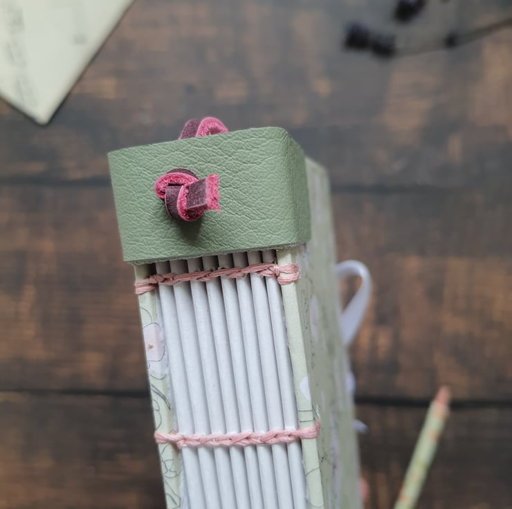 This hand-bound notebook has solid floral covers in pale greens, pinks and white, with an open spine showing the pretty pink stitching. Leather details have been added to the spine to complement the colour scheme. A leather cord is fastened to the spine to use as a page marker, while ribbons have been attached to ties the journal closed. There's also a small pocket on the inside back cover.