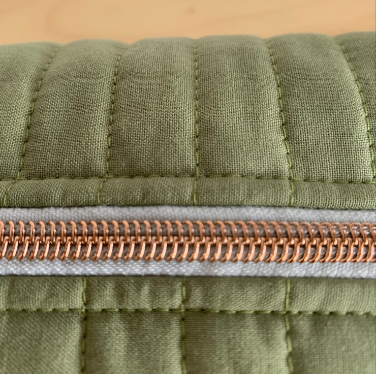 The bag is quilted with sage green stitching and has a rose gold and white colour zip.