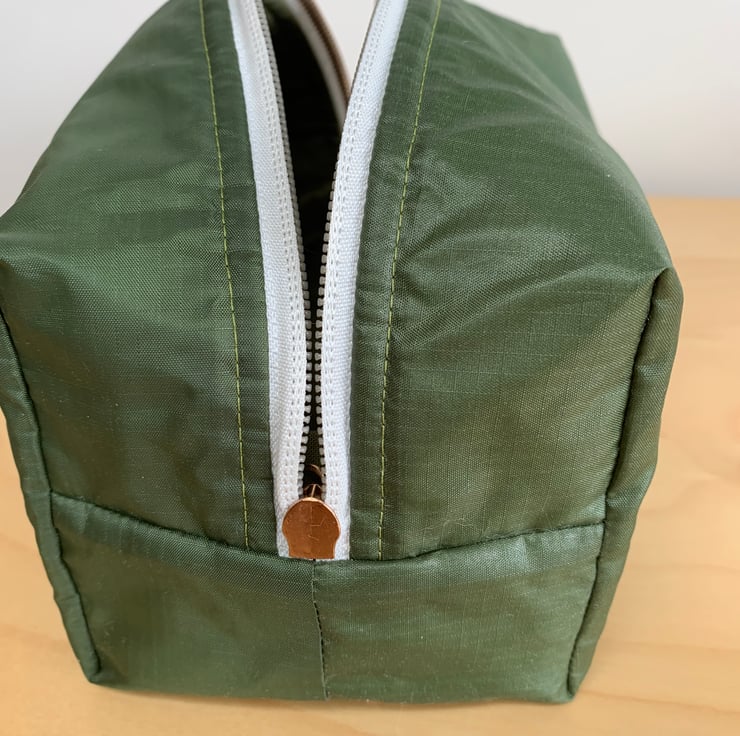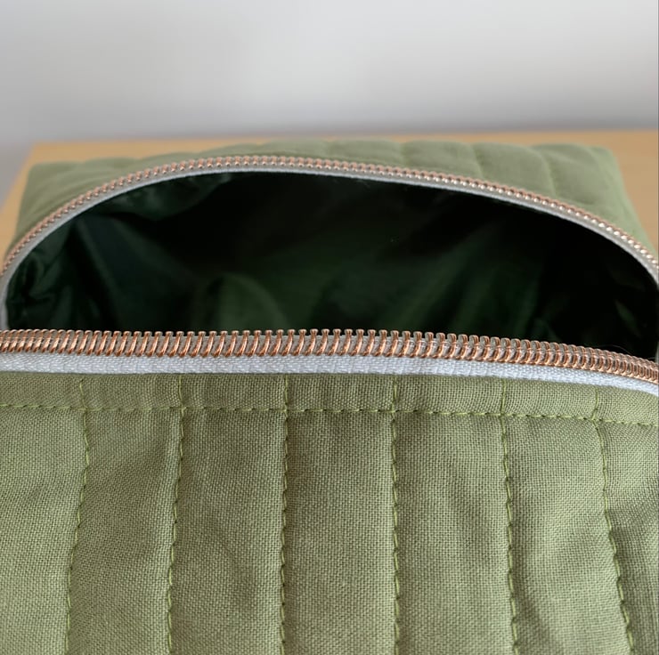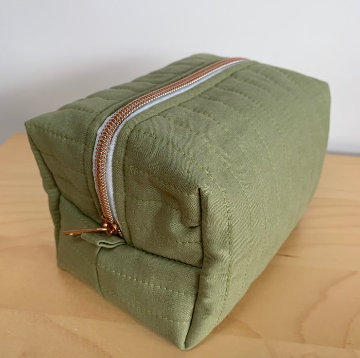 The box shape makeup bag is made with this beautiful sage green cotton fabric.