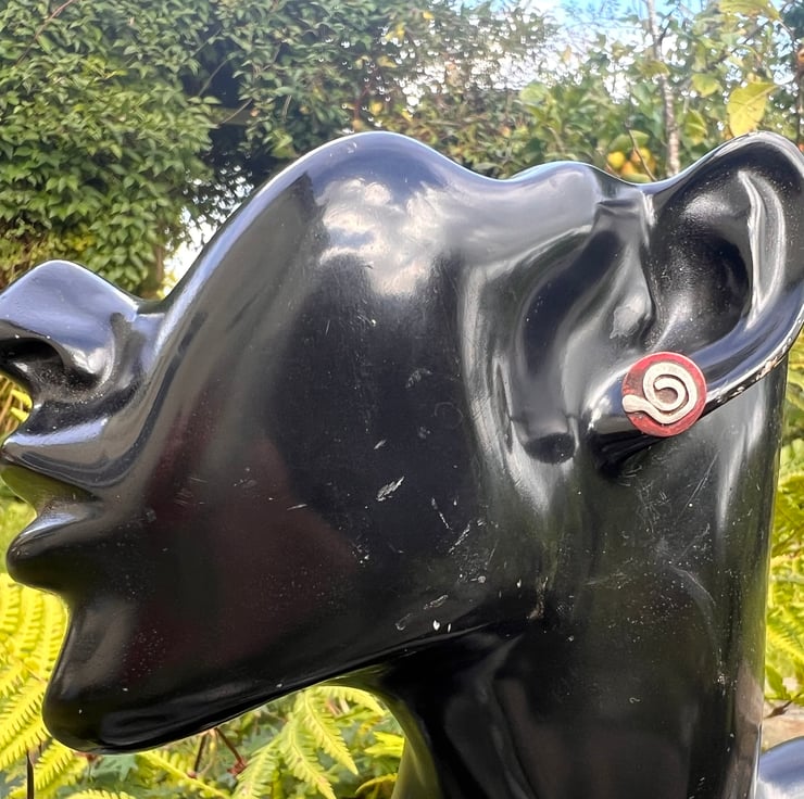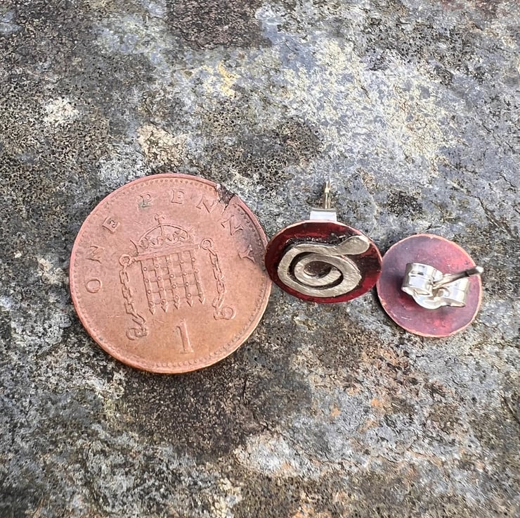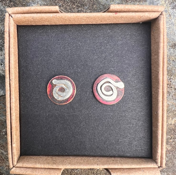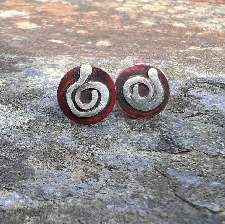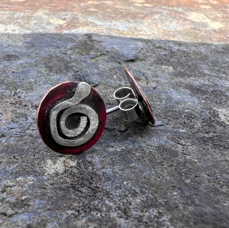 Copper round discs with a diameter of 11mm and a sterling silver swirl . The copper has gained deep red tones as a result of heat and the rich colours are preserved with a penetrating wax. They are fastened to the ear with sterling silver earposts and scroll backs.