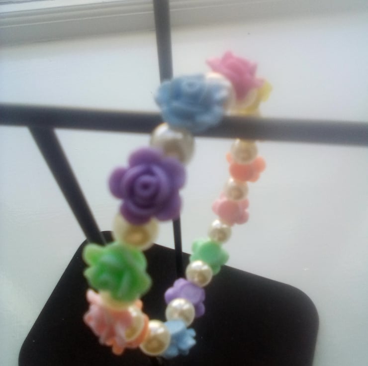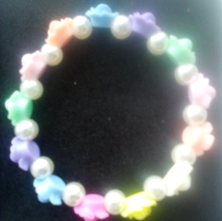 Rainbow flower stretchy beaded bracelet white pearls with Green, light blue, peach, lights pink, purple, yellow and light yellow.