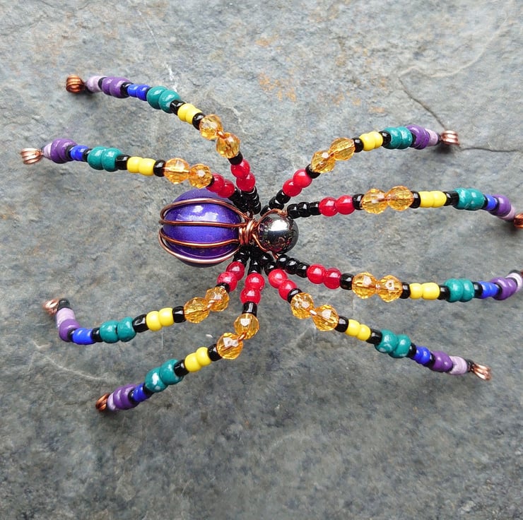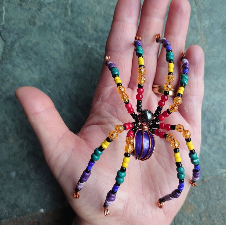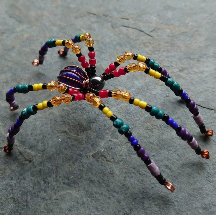 It's made from recycled costume jewellery and reclaimed copper electrical wire. Its legs can be gently repositioned, but please don't bend them too much: this puts excessive stress on the beads, and they may fracture. There may be the odd sharp wire end in the feet. Because of these concerns, please note that this spider is not a toy, and is not suitable for children.