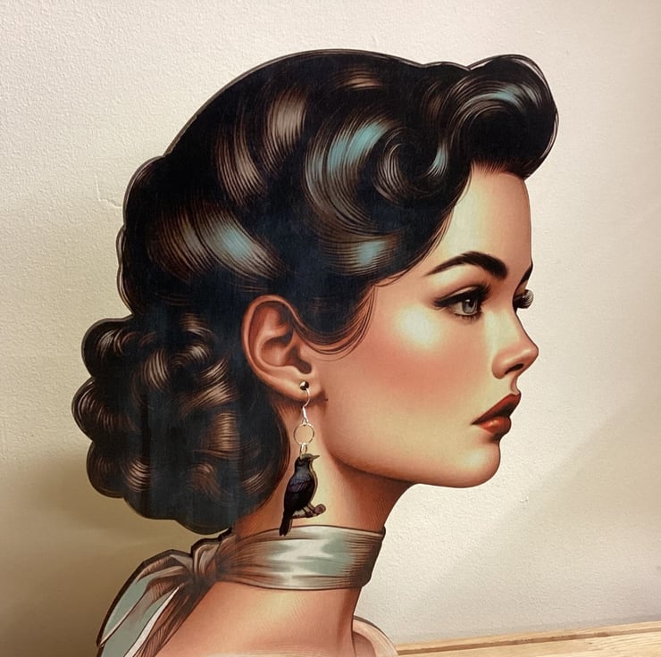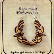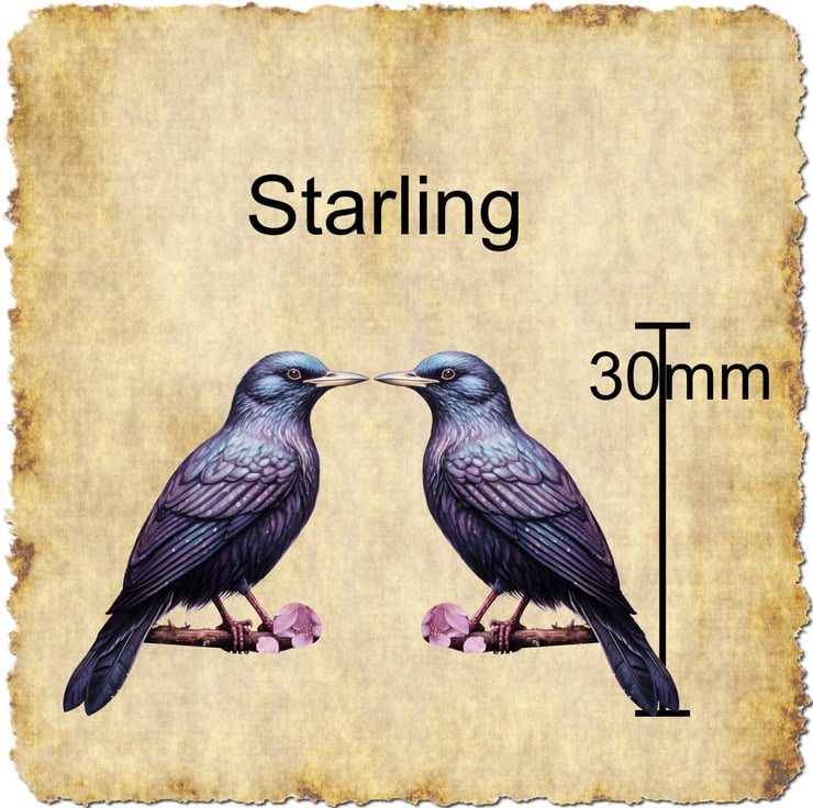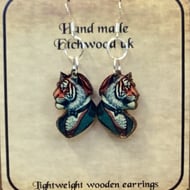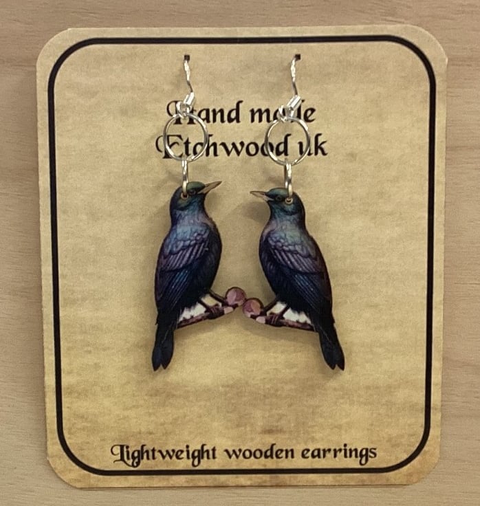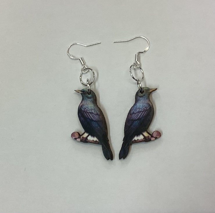 Delicate Starling Bird, wooden earrings, Both unusual and tasteful .An irridescent graphic backed by a Laser wood cut for rigidity. A statement piece of jewellery
