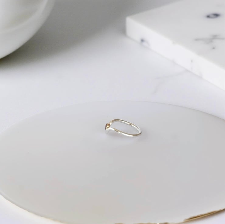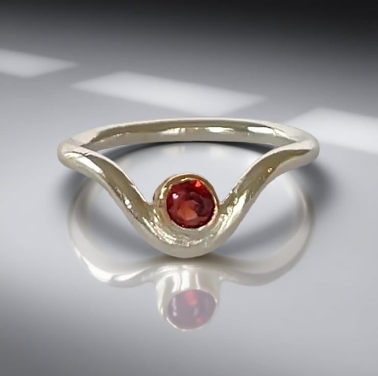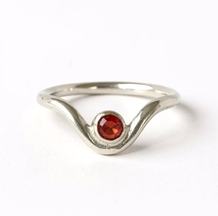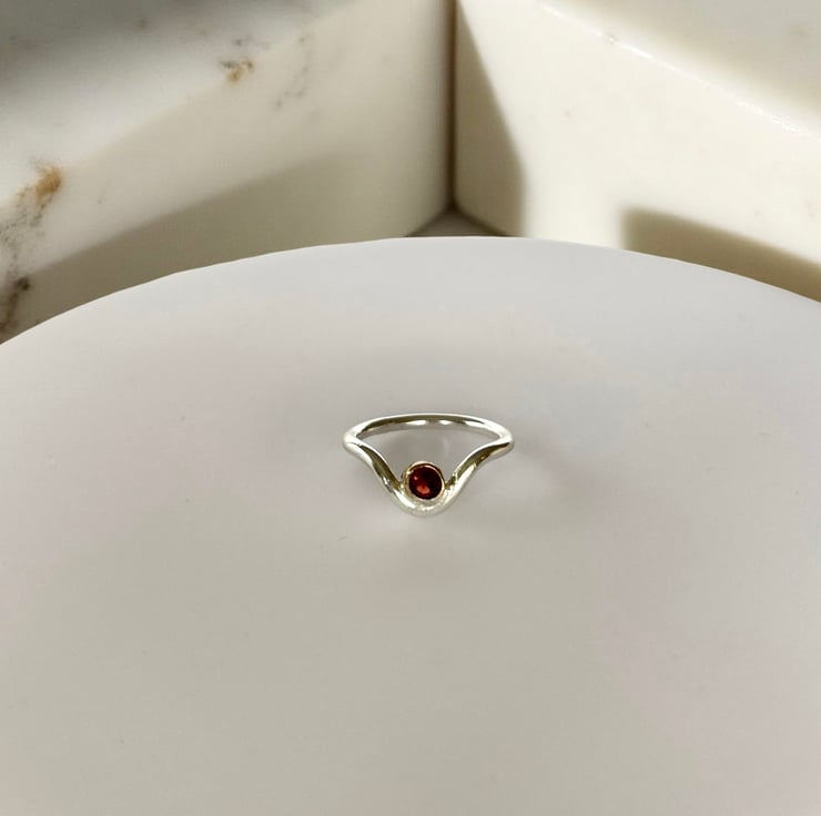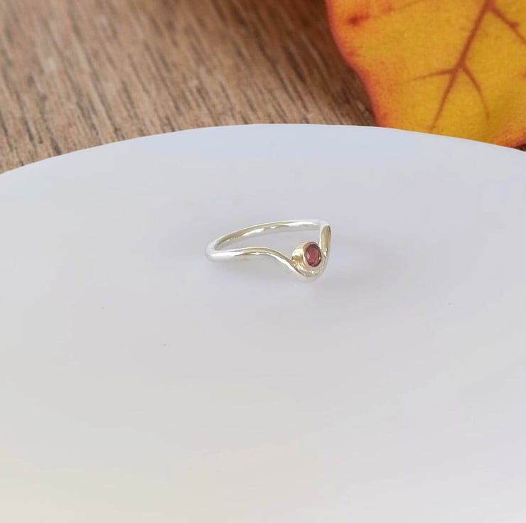 A contemporary yet timeless piece, this handmade sterling silver wishbone ring features a 4mm deep red garnet gemstone encased in a polished 9ct gold bezel. The elegant contrast of silver and subtle gold creates a unique design that is both stylish and versatile, perfect for everyday wearer as a meaningful gift.