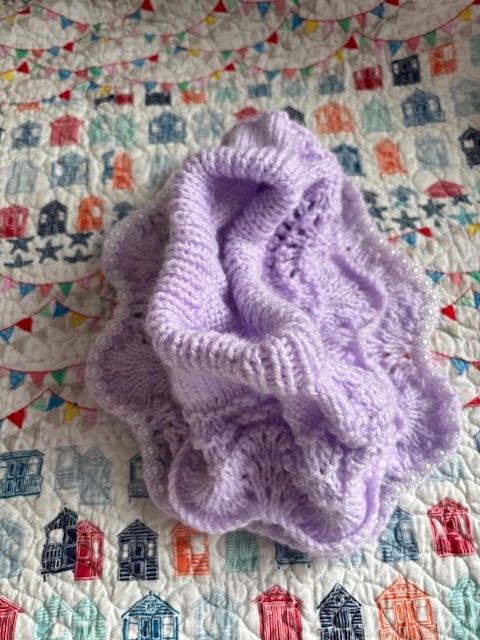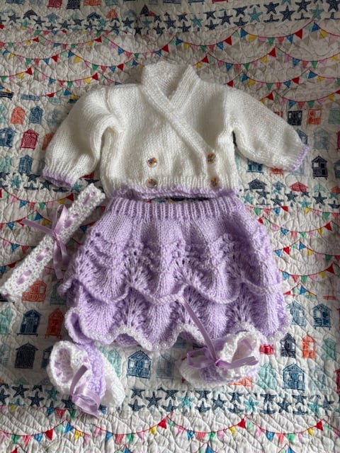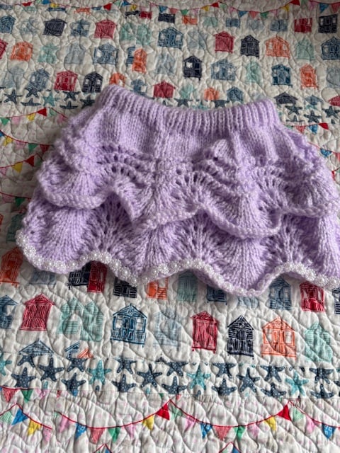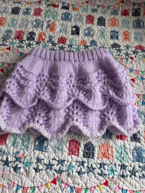 A lilac skirt, with two layers of hand knitted feather lace work, trimmed on the bottom frill with a pearl decorative braiding, elasticated waist for a snug fit.