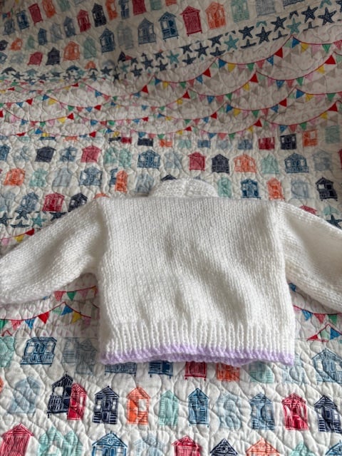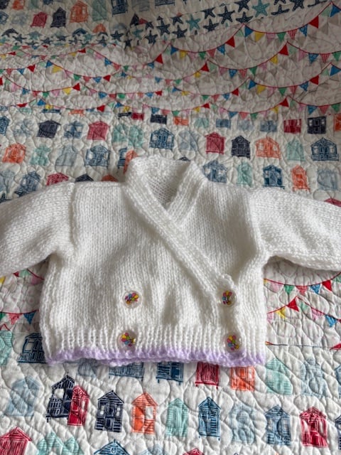 A white cross over "ballet" style cardigan with lilac trim on the edges and sleeves, and secured with four buttons