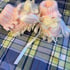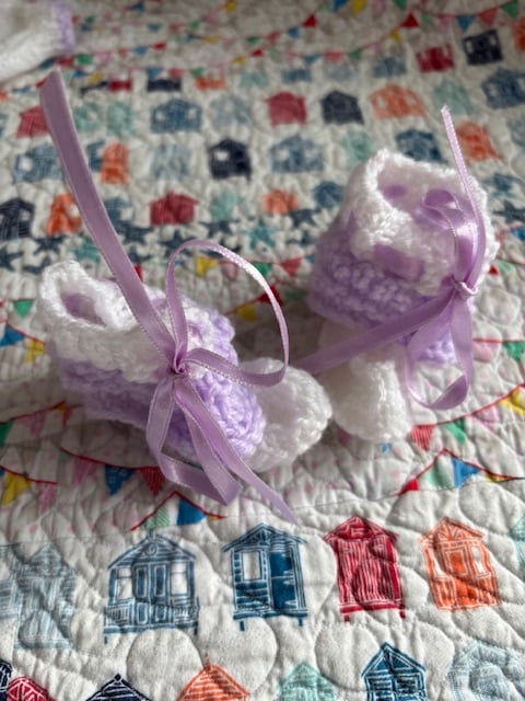 A pair of white and lilac shoes, with the same knitted frill and secured with white silk ribbon around the attached white sock.