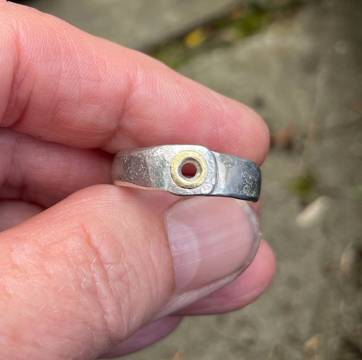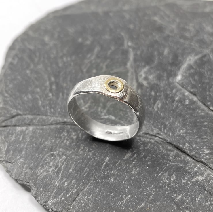 The silver has been hammered to form a smooth overlap and texture, it has been soldered to prevent any snagging. The gold ring has been shaped to resemble a tube rivet.