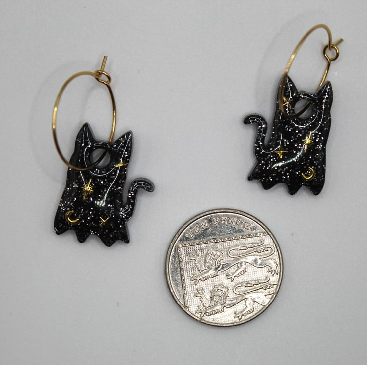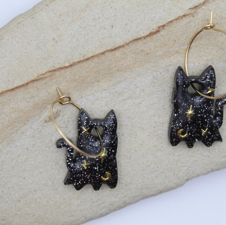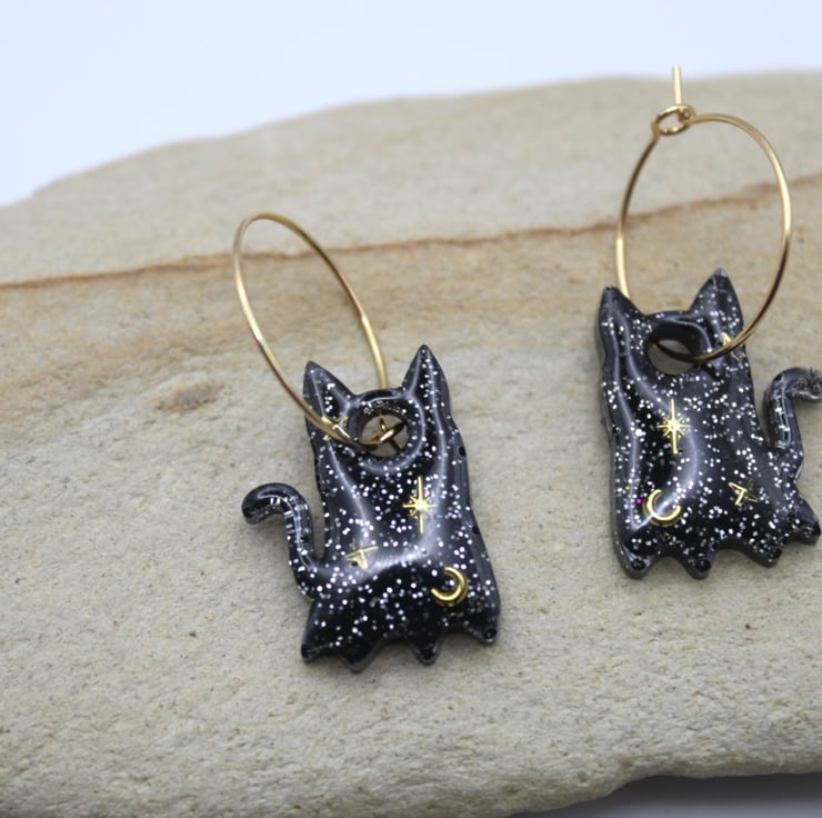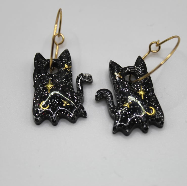 These whimsical cat ghost earrings have been maybe with epoxy resin. On the first layer I have used clear resin with some celestial charms and once it was cured I've added a layer of sparkly black resin to look like the night sky.